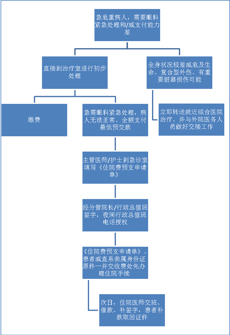 (一)眼科急診病人直接到治療室進(jìn)行初步處理,再進(jìn)行掛號繳費(fèi)。對于支付能力差的病人,主管醫(yī)生認(rèn)為急需眼科處理但病人無法正常、全額支付最低預(yù)交款的,可到咨詢臺(急診診室)填寫《住院費(fèi)預(yù)支申請單》,經(jīng)分管院長或行政總值班簽字,先予以緊急處理。