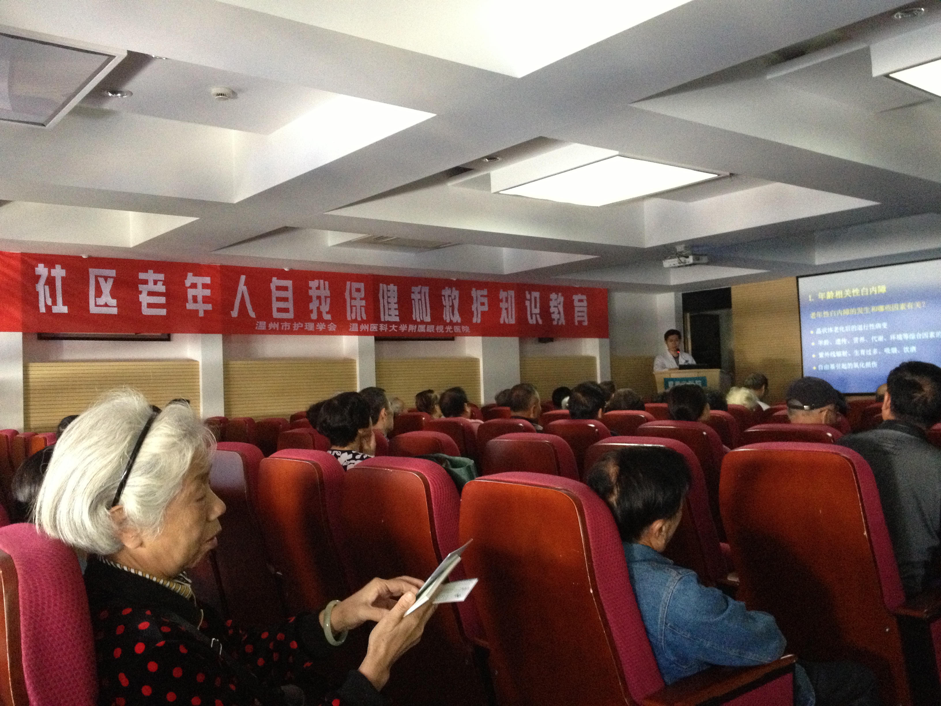 隨著人口逐漸老齡化,老年性白內(nèi)障已成為世界性的常見多發(fā)眼病,常見于40歲以上,隨著患者年齡的增長,白內(nèi)障發(fā)病率將越來越高。目前手術(shù)仍是治療白內(nèi)障最有效的方法,為了讓廣大老年市民能更了解白內(nèi)障的知識,10月23日上午10時在我院學術(shù)報告廳,白內(nèi)障專科宮賢惠副主任醫(yī)師給廣大社區(qū)市民帶來一場有關(guān)白內(nèi)障的健康知識講座。