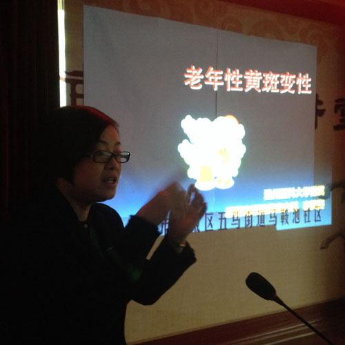 為了讓廣大市民能更好的了解這個(gè)疾病,2015年3月26日下午4點(diǎn)我院眼底內(nèi)科李英姿醫(yī)師走進(jìn)馬鞍池社區(qū),為社區(qū)廣大的市民講解有關(guān)的老年性黃斑變性這個(gè)疾病,會(huì)議室里早已擠滿了社區(qū)居民,李醫(yī)師用簡(jiǎn)單而又通俗的話講解該病的發(fā)病病因,及治療方法,及日常生活的飲食注意,在場(chǎng)的市民都表示能聽的懂李醫(yī)師的講解。