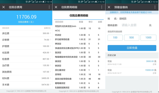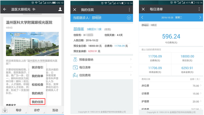 住院患者可以在“診療”→“我的住院”中進(jìn)行住院預(yù)繳金,每日清單和費(fèi)用明細(xì)的查看。