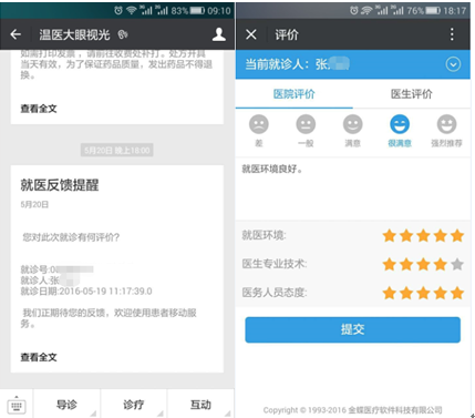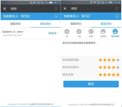 就診完,平臺會在就診當(dāng)天推送“就醫(yī)反饋提醒”或進(jìn)入“互動”→“就醫(yī)反饋”對醫(yī)院整體環(huán)境和就診醫(yī)生進(jìn)行評價(jià),歡迎提出寶貴意見。