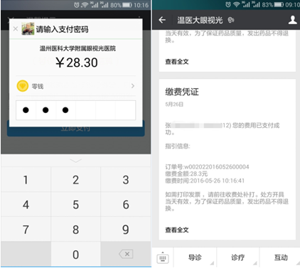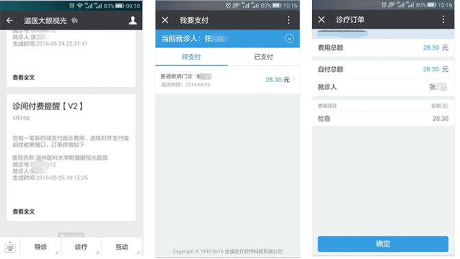患者就診后,平臺會推送診間支付提醒或點(diǎn)擊“診療”→“我的賬單”→“待支付”→“完成支付”。患者支付成功,然后收到繳費(fèi)憑證,根據(jù)指引信息進(jìn)行取藥、檢驗(yàn)、檢查、治療等服務(wù)。