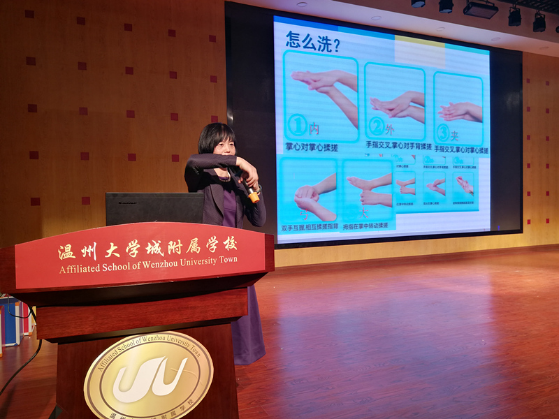 鄭主任利用圖文并茂的PPT動畫、科學(xué)的實驗數(shù)據(jù)、通俗易懂的文字語言和豐富的肢體語言,向同學(xué)們展示了為什么要洗手、什么時候應(yīng)該洗手和怎么正確洗手的相關(guān)知識。同學(xué)們也積極參與到講座互動中,深刻體會與理解日常生活中洗手時機和正確洗手的相關(guān)知識。