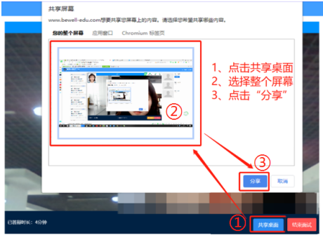 ??1. 個(gè)人陳述環(huán)節(jié)須采用PPT匯報(bào)——采用共享桌面操作步驟:①點(diǎn)擊視頻頁(yè)面下方“共享桌面”按鈕;②彈框中選擇“您的整個(gè)屏幕”;③點(diǎn)擊“分享”;④點(diǎn)擊“結(jié)束共享”,切回視頻畫面。共享桌面未成功時(shí),考生將無法進(jìn)入正常視頻畫面。?