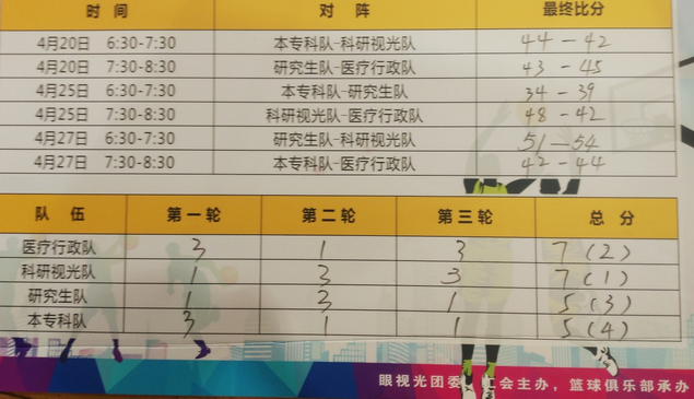 本次師生籃球賽競爭異常激烈,經過三日共計6場的激烈比賽,各隊勝負分差最大才6分,其中四場比賽的差距僅為一球之差,四隊排名通過最后一場比賽結束才最后確定。三日的賽程非常緊湊,每場比賽都異常激烈精彩,各隊實力相當,每場比賽分差都在10分內,每場比賽的懸念都留到了最后一節(jié),甚至最后的10秒鐘才決出勝負。最終科研視光隊(含生材所)和醫(yī)療行政隊兩勝一負積7分,研究生隊和本??脐犚粍賰韶摲e5分,根據積分相同兩隊勝負關系優(yōu)先原則,科研視光隊(含生材所)獲得了本次師生籃球賽的冠軍,醫(yī)療行政隊獲得亞軍,研究生隊獲得季軍,本??脐牜@得第四名。在比賽中,競技體育的精神得到了良好的體現,拼搏,永不言敗,團隊協(xié)作等等,希望明年可以看到更加精彩的比賽。