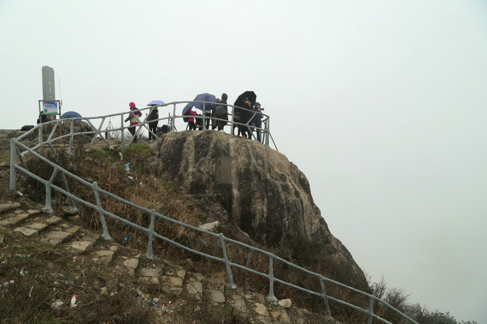 第三站,瑞安金雞山。金雞山高1321米,有東甌第一高峰的美稱。到達(dá)金雞山,已是下午三點(diǎn)多,車開到半山腰,沿著山路拾級而上,不一會兒就到了山頂。由于剛下過雨,山頂上云霧繚繞,仿佛置身仙境。偶有一陣風(fēng)吹過,驅(qū)散云霧,依稀可見盤山公路九曲十八彎,像一條巨龍纏繞著金雞山,甚是壯觀。