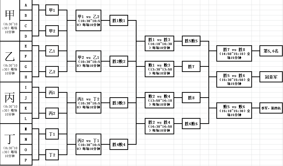 3.??? 比賽時(shí)間:初賽、復(fù)賽不分上、下半時(shí),全場(chǎng)比賽10分鐘,每隊(duì)可有一次暫停機(jī)會(huì),決賽分上、下半時(shí),每場(chǎng)8分鐘,中場(chǎng)休息3分鐘。