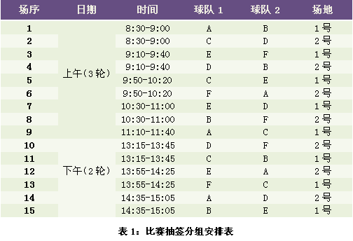 比賽前一周(具體時間和地點另行通知),由各參賽組的隊長參加分組抽簽,各隊長隨機抽取一張標有A、B、C、D、E、F的標簽根據(jù)以下分組安排表對號入座,決定比賽順序。