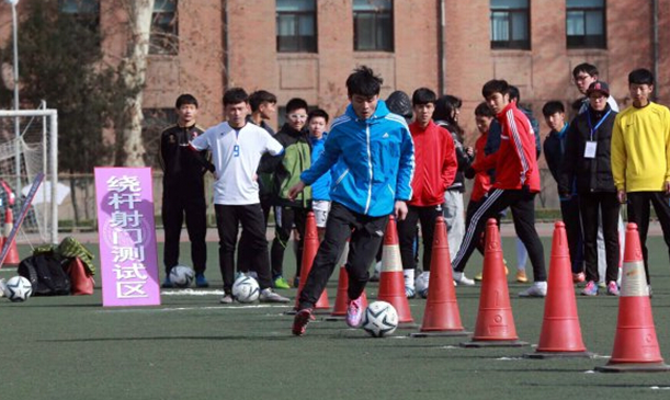 繞桿射門比賽每隊(duì)時(shí)間為5分鐘,每隊(duì)派5名隊(duì)員參加比賽。設(shè)有立桿6個(gè),每立桿間隔為1.5米,氣跑點(diǎn)距第一立桿3米。在5分鐘內(nèi),每隊(duì)由5名運(yùn)動(dòng)員進(jìn)行繞桿接力,第1名參賽隊(duì)員聽到起跑信號(hào)后,依次繞過6個(gè)立桿,并完成射門,射門后不管進(jìn)或不進(jìn)必須馬上回歸隊(duì)伍(射門進(jìn)球得分,不進(jìn)球不得分),第2-5名隊(duì)員依次進(jìn)行接力。