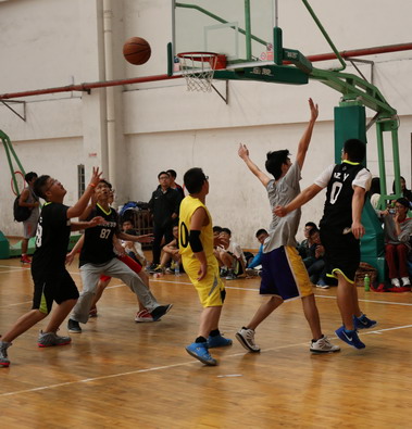 第二節(jié)及第三節(jié)是本場(chǎng)比賽的高潮。第二節(jié)伊始,學(xué)生隊(duì)開(kāi)始發(fā)力,一步步緊逼教師隊(duì),把比分差距一點(diǎn)點(diǎn)拉小。與此同時(shí),教師隊(duì)也不甘示弱,由付映杰老師助攻,主攻老師反身防守假動(dòng)作帶球向前上籃。學(xué)生隊(duì)雖然汗流浹背,但仍全力以赴,一有機(jī)會(huì)便截球。經(jīng)過(guò)2小時(shí)的酣戰(zhàn),最終學(xué)生隊(duì)不敵經(jīng)驗(yàn)豐富的教師隊(duì),以41:53惜敗。