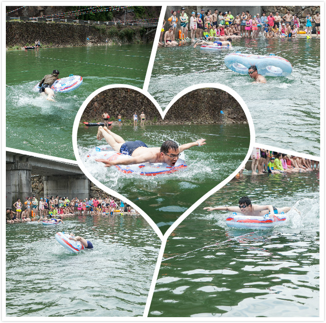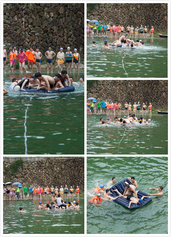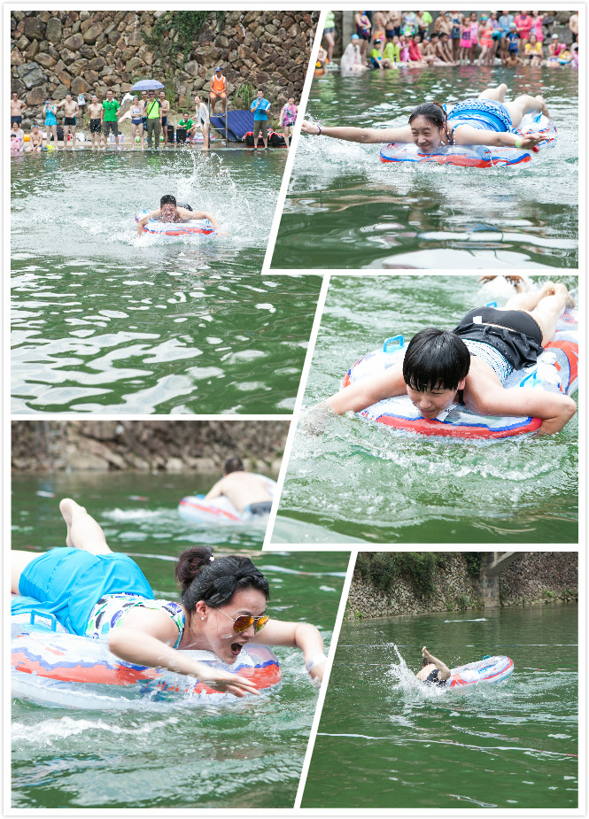 水上趣味運(yùn)動(dòng)會(huì)不同于正式的游泳比賽,更加側(cè)重于趣味性,你瞧:我們的項(xiàng)目有臥墊刨泳,劃船比賽,水上拍照等,非常有趣味性的比賽項(xiàng)目,比賽中總是意外連連,讓大家都笑噴了。臥墊刨泳的直線式比賽有幾組隊(duì)員變成在水里打圈圈了,怎么也到達(dá)不了終點(diǎn),而有的隊(duì)員因體重偏胖,總是爬上墊子就翻到水里,沒辦法只好換人了,劃船比賽需兩人合作,當(dāng)他們合作不夠默契時(shí),氣墊船也是扭扭捏捏的前進(jìn),就像待嫁的小媳婦一樣。而最人拭目以待的比賽是水上拍照項(xiàng)目,每個(gè)隊(duì)伍各派4名隊(duì)員,由4組隊(duì)員在1分鐘內(nèi)同時(shí)游向水面上的氣墊,并以成功站在氣墊上的人數(shù)為準(zhǔn),合作最好的隊(duì)伍成功的將自己組4名隊(duì)員都拉上氣墊,而第一組比賽中,由于過于激烈,整個(gè)氣墊都翻了個(gè)個(gè),當(dāng)然墊上的人員也都落水了,看著都讓人揪心呢。值得表?yè)P(yáng)的是小孩隊(duì),不論是臥墊刨泳比賽還是劃船比賽中,各個(gè)小男孩像箭一樣直射出去,穩(wěn)當(dāng)、速度又快,讓人羨慕西羨慕呀。