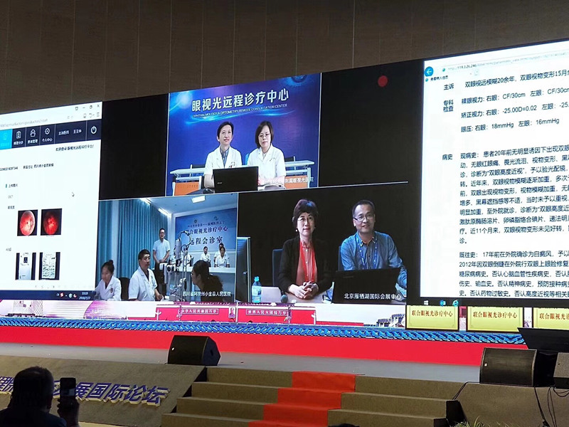 四川省小金縣的一位28歲高度近視的患者現(xiàn)場(chǎng)接受了來(lái)自溫州醫(yī)科大學(xué)附屬眼視光醫(yī)院和北京大會(huì)現(xiàn)場(chǎng)專(zhuān)家的會(huì)診。來(lái)自小金縣人民醫(yī)院的醫(yī)生通過(guò)平臺(tái)匯報(bào)病史和開(kāi)展輔助檢查的基礎(chǔ)上,遠(yuǎn)在溫州和北京的專(zhuān)家實(shí)時(shí)通過(guò)遠(yuǎn)程醫(yī)療平臺(tái)講解分析病情,指導(dǎo)小金醫(yī)生進(jìn)行相關(guān)檢查,裂隙燈結(jié)果檢查清晰顯示在三方各自屏幕上,借助于該遠(yuǎn)程系統(tǒng),來(lái)自全國(guó)各地的患者將及時(shí)得到眼科專(zhuān)家的遠(yuǎn)程診療意見(jiàn)。