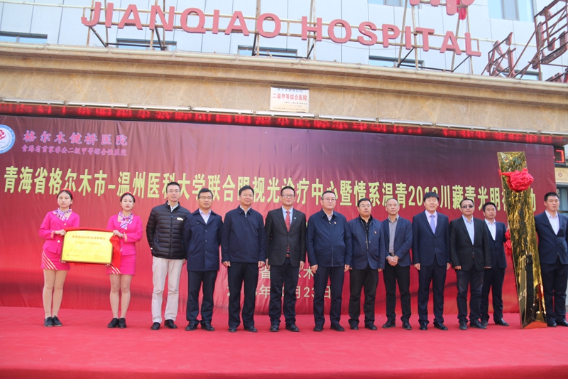 10月23日上午,青海省格爾木市—溫州醫(yī)科大學(xué)聯(lián)合眼視光診療中心成立揭牌儀式暨“情系溫青,2018川藏青光明行”大型義診啟動(dòng)儀式在格爾木健橋醫(yī)院隆重召開。浙江援青指揮部副指揮長(zhǎng)章萬(wàn)真;格爾木市人民政府副市長(zhǎng)李曉兵;格爾木市人民政府副秘書長(zhǎng)馬勇;格爾木衛(wèi)生和計(jì)劃生育局局長(zhǎng)潘衛(wèi)忠;中共溫州醫(yī)科大學(xué)眼視光學(xué)院附屬眼視光醫(yī)院黨委副書記張建;杭州清大視光科技有限公司副總經(jīng)理尹石琦;溫州醫(yī)科大學(xué)附屬眼視光醫(yī)院防盲治盲辦公室主任涂昌森、視光診療中心副主任于旭東出席了儀式,儀式由格爾木健橋醫(yī)院院長(zhǎng)魏振斌主持。