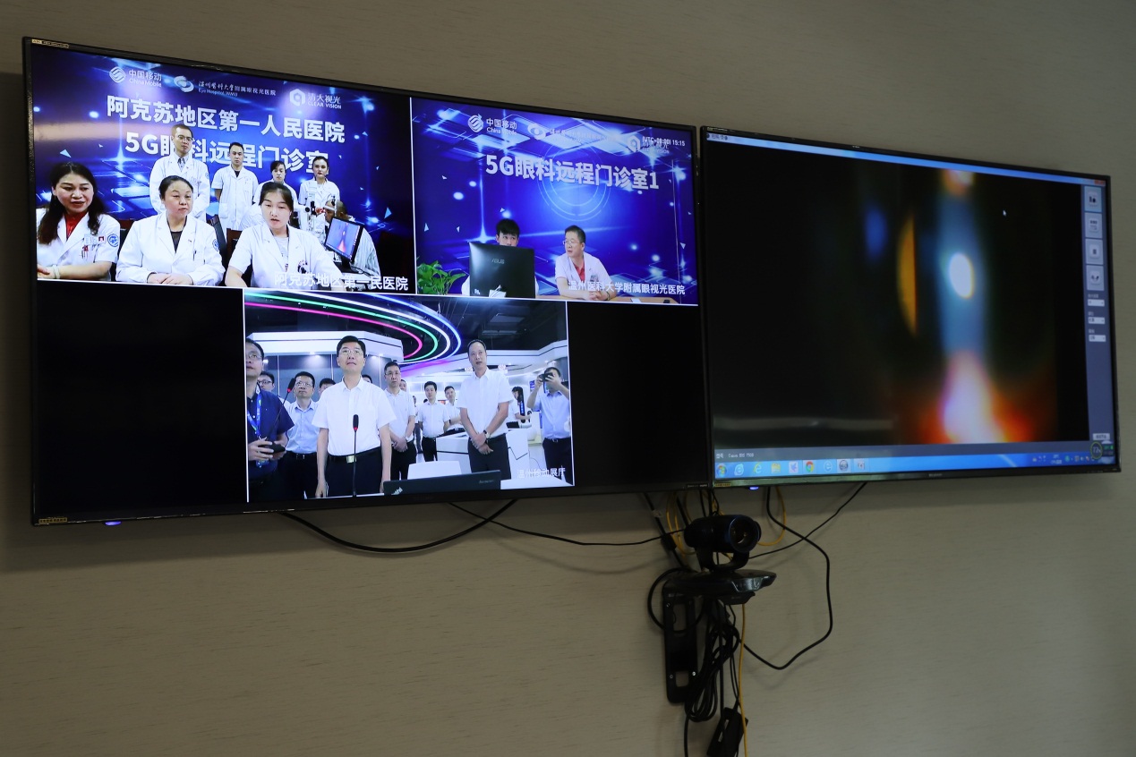 當天下午,移動溫州分公司5G應(yīng)用展示廳現(xiàn)場,一場跨越萬里的5G遠程門診正在進行。50歲的維吾爾族患者陳沙(化名)7天前突然左眼視力下降明顯,一直沒能得到有效的治療。聽聞通過5G遠程診療能直接和溫醫(yī)大眼視光的專家面對面診療,陳沙按預(yù)約時間來到了阿克蘇地區(qū)第一醫(yī)院。阿克蘇的醫(yī)生們在溫醫(yī)大附屬眼視光醫(yī)院副院長吳文燦教授的指導下,現(xiàn)場對陳沙的病情進行分析。結(jié)合上傳的高清眼底圖像和輔助檢查報告,吳文燦教授清楚地獲得了陳沙的病情資料,并結(jié)合采集的病歷資料及現(xiàn)場詢問,快速高效確診出病情并和阿克蘇的醫(yī)生討論得出最適合的診療方案。
