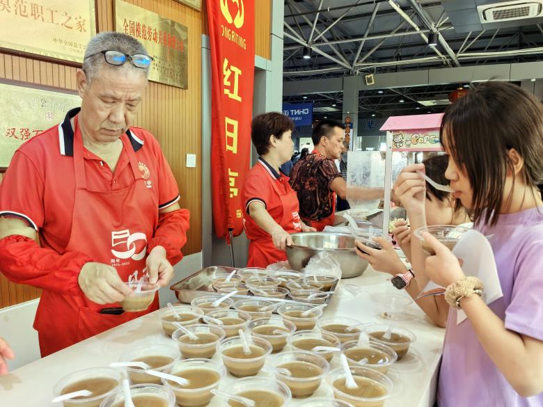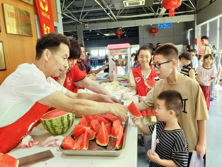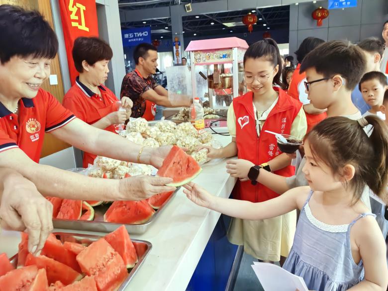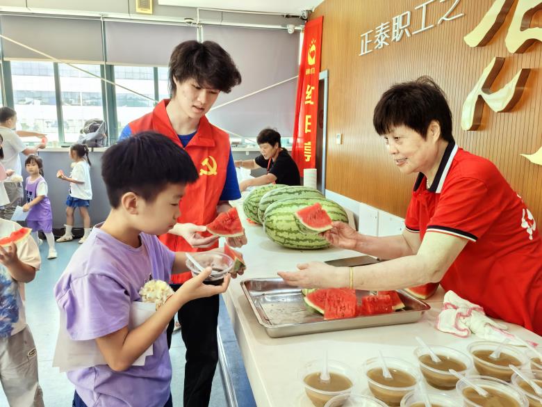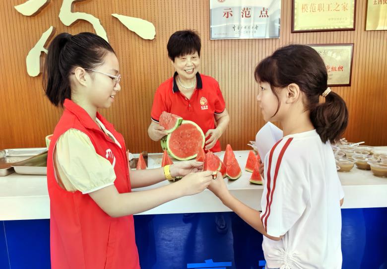 當(dāng)天,紅日亭負(fù)責(zé)人孫蘭香帶領(lǐng)金光龍、沙定友、張曉萍、林文龍、黃加松、陳興社等志愿者,把“流動(dòng)伏茶車”開(kāi)到正泰集團(tuán),帶來(lái)了大西瓜、綠豆湯、涼粉等清涼食品,還有學(xué)生們喜歡的爆米花。