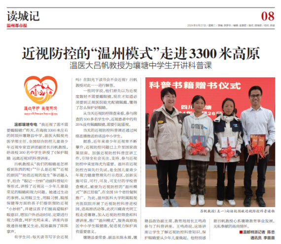 溫都壤塘專電 “我近視了需不需要戴眼鏡?”8月26日,在海拔3300米左右的阿壩州壤塘縣中學(xué),溫醫(yī)大眼視光醫(yī)學(xué)部主任、全國(guó)綜合防控兒童青少年近視專家宣講團(tuán)副團(tuán)長(zhǎng)呂帆教授,給該校300名中學(xué)生講授了《保護(hù)眼睛 遠(yuǎn)離近視》的科普講座。