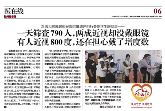 “我們在篩查中發(fā)現(xiàn),有不少近視學(xué)生不佩戴眼鏡或不規(guī)范佩戴眼鏡?!睖蒯t(yī)大附屬眼視光醫(yī)院的專家提醒,如果近視了,要到正規(guī)醫(yī)院檢查視力,配戴眼鏡,以免近視進(jìn)一步加深。