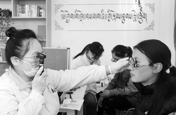近日,溫州醫(yī)科大學(xué)附屬眼視光醫(yī)院組織醫(yī)護(hù)人員走進(jìn)四川省阿壩藏族羌族自治州壤塘縣中學(xué),為該校1500多名學(xué)生開(kāi)展近視篩查,普及愛(ài)眼護(hù)眼知識(shí),并向部分近視學(xué)生贈(zèng)送眼鏡。圖為醫(yī)護(hù)人員在查看學(xué)生眼健康狀況。