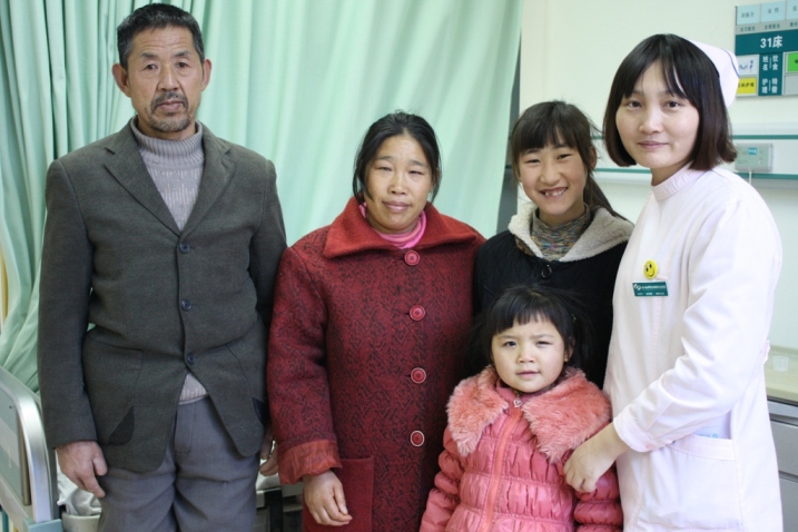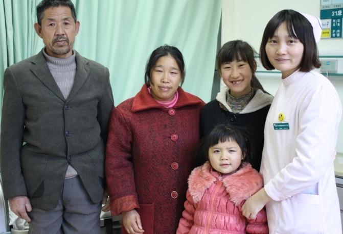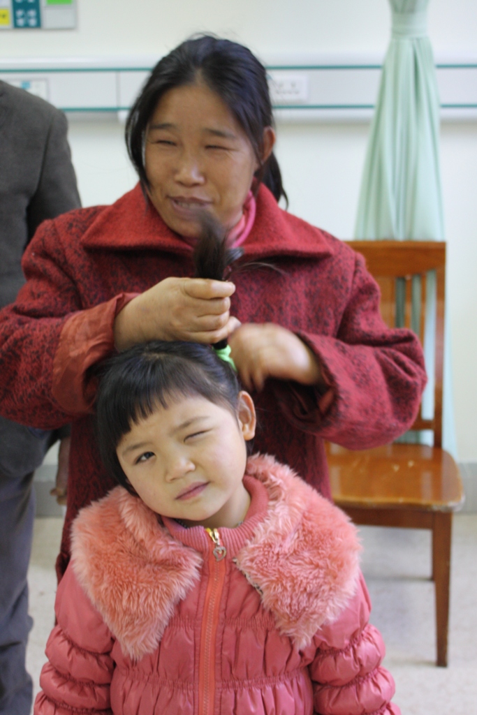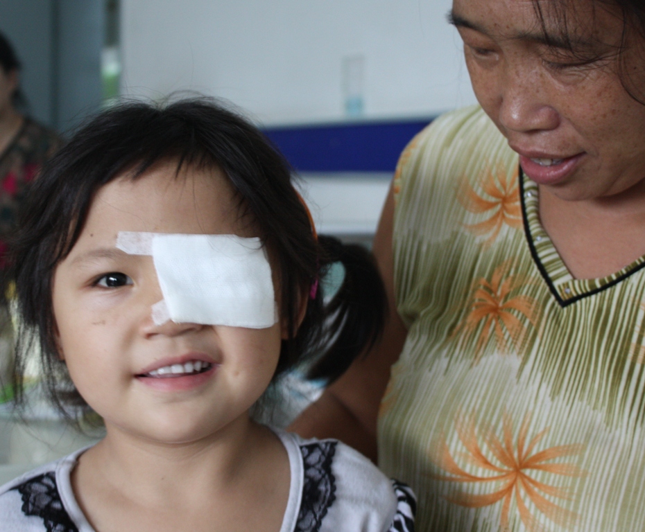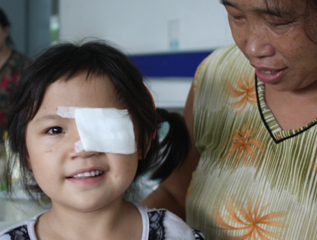 去年的 8月26日晚上 ,突如其來的災(zāi)難臨到了小朝翠身上。左眼不小心被剪刀戳到,醫(yī)生診斷“左眼角膜穿通傷”及“左眼外傷性白內(nèi)障”,需馬上入院手術(shù)治療!這時伴隨左右的爺爺奶奶卻犯難了。朝翠的父親失蹤多年,母親改嫁,出生至今都由爺爺奶奶撫養(yǎng)。奶奶前年因車禍受傷,一直呆在家里照看孫女以及一位弱智的女兒。憨厚的爺爺幾年前來溫州,靠打散工養(yǎng)活一家人。如今面對著飛來橫禍,心里再焦急也無法拿出手術(shù)的費用。值班的醫(yī)生和病區(qū)的醫(yī)護人員馬上一面勸說其入院,一面向我院防盲治盲辦公室反映情況,申請資助。防盲辦在了解情況后,決定對其進行救助,并也就在這個時候,太平慈善功德會一位熱心的女士聽到了小朝翠的故事,馬上送來15000元??钣糜谒氖中g(shù)治療。就這樣,在眾人的共同努力下,朝翠入院進行了第一期手術(shù)。三個多月后,小姑娘再次來到六病區(qū),完成了第二次的手術(shù):人工晶體植入術(shù)。