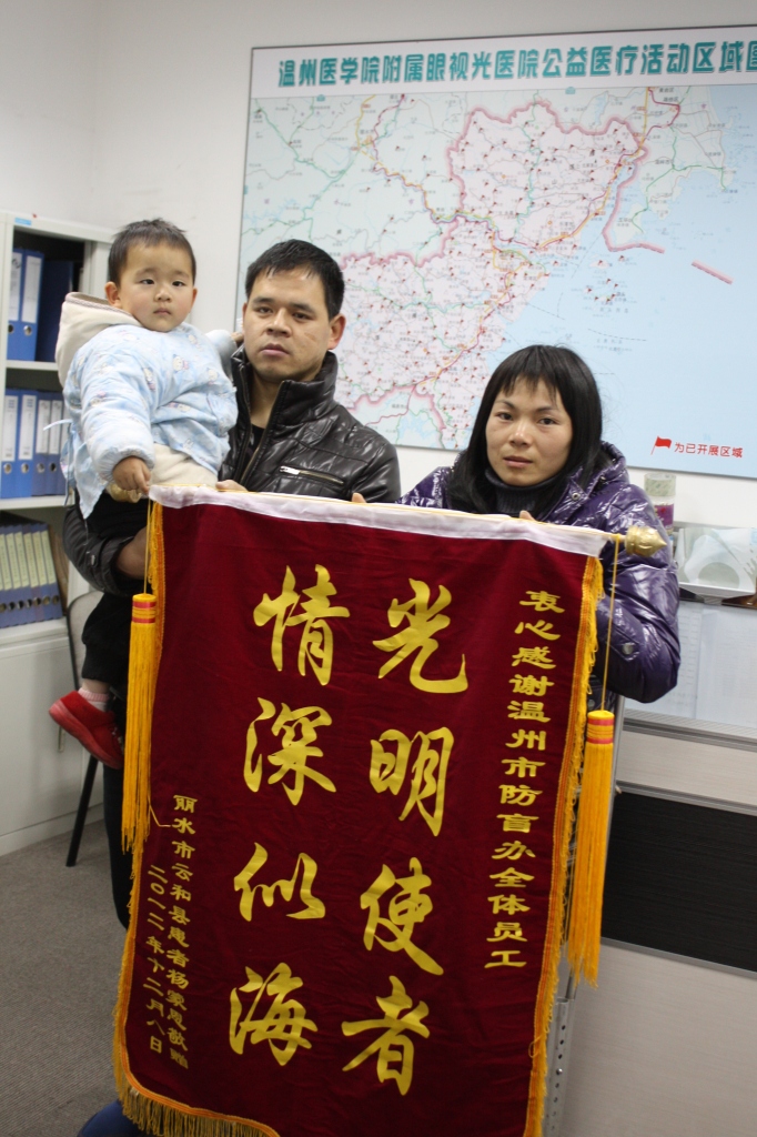 送錦旗的一家子來自麗水云和,父親是先天性白內(nèi)障患者,母親也是雙腿殘疾,需要借助拐杖行走。因為兩歲的小女兒楊楊,他們于今年3月份走進了我院。經(jīng)診斷,小楊楊由于遺傳父親的先天性白內(nèi)障,雙眼視力僅為眼前手動,只有通過手術(shù)才能讓小楊楊看見這個美好的世界。醫(yī)生為她實施了第一期手術(shù):雙眼白內(nèi)障超聲乳化吸除+前段玻璃體切除術(shù)。但是面對后續(xù)的晶體植入手術(shù),原本就貧困的家庭一籌莫展,這無疑是一個他們無力承擔(dān)的重?fù)?dān)。