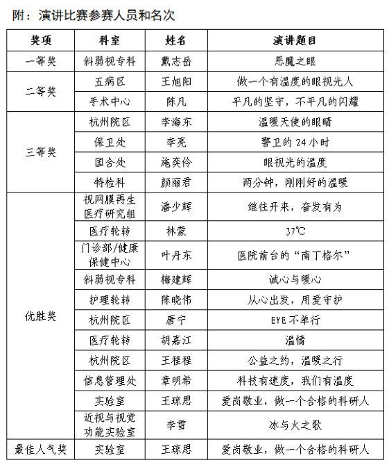 參賽選手秉承“友誼第一、比賽第二”的精神,使得現(xiàn)場慷慨激昂,精彩不斷。評委們通過對演講者的內容架構、肢體表現(xiàn)、形象表現(xiàn)、聲音表現(xiàn)、口才語言、現(xiàn)場效果、時限控制等方面的表現(xiàn)打分,最終由斜弱視專科的戴志岳獲得此次演講比賽一等獎,五病區(qū)的王旭陽和手術中心的陳凡獲得二等獎,杭州院區(qū)的李海東等4人獲得三等獎,信息管理處章明希等11人獲得優(yōu)勝獎,實驗室的王瓊思獲得最佳人氣獎。