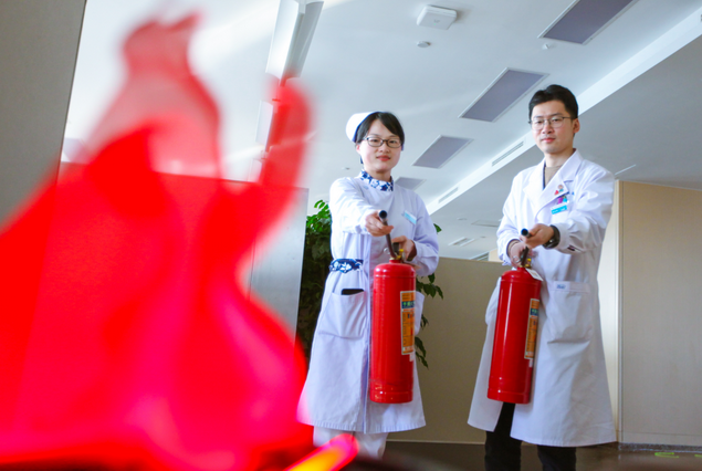 醫(yī)護(hù)人員嫻熟地提起滅火器,一提、二拔、三壓、四噴,撲滅初期火災(zāi)。