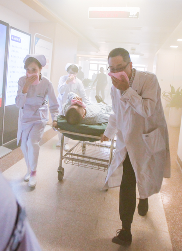 疏散引導(dǎo)組工作人員迅速趕赴火場,指揮人群有組織地疏散,分發(fā)濕毛巾、防護(hù)用品并護(hù)送病人安全、有序的從就近兩側(cè)消防疏散通道,醫(yī)療救護(hù)組運(yùn)用擔(dān)架、輪椅運(yùn)送行動不便的和危重的患者安全撤離。引導(dǎo)人員撤離至安全區(qū)域后并對人數(shù)進(jìn)行了清點(diǎn)。