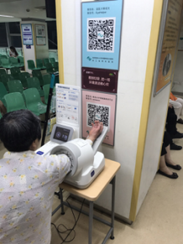 眼病門(mén)診候診大廳增設(shè)了價(jià)值二萬(wàn)多的電子血壓計(jì),為患者免費(fèi)監(jiān)測(cè)自己的血壓。電子血壓計(jì)的數(shù)據(jù),患者可以直接測(cè)量打印,再由護(hù)士黏貼在紙質(zhì)病歷上,高效方便。