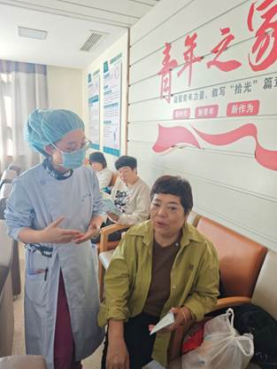 圖 1姜婉娜醫(yī)生在麻醉與疼痛門診揭牌儀式后對患者進行疼痛宣教