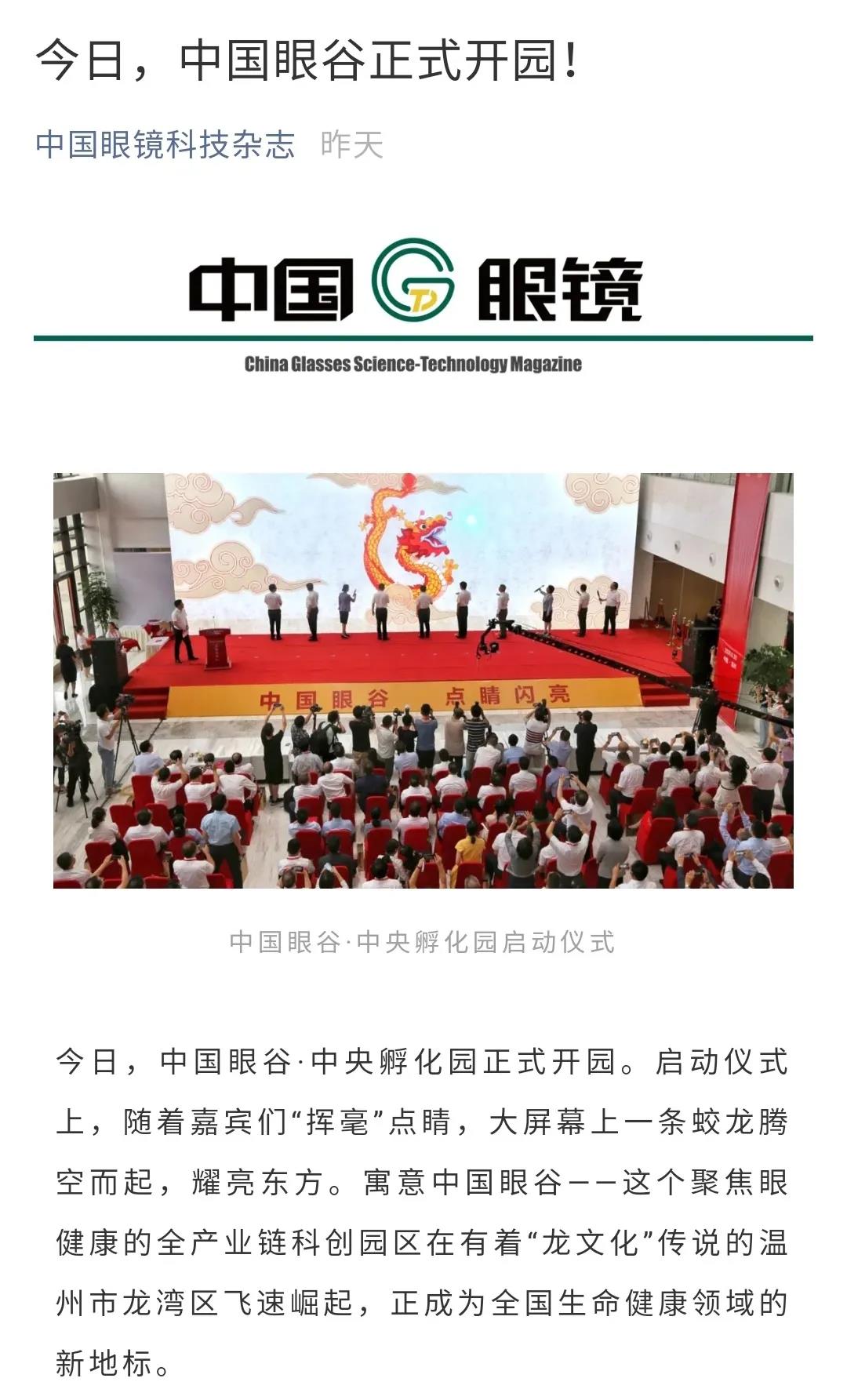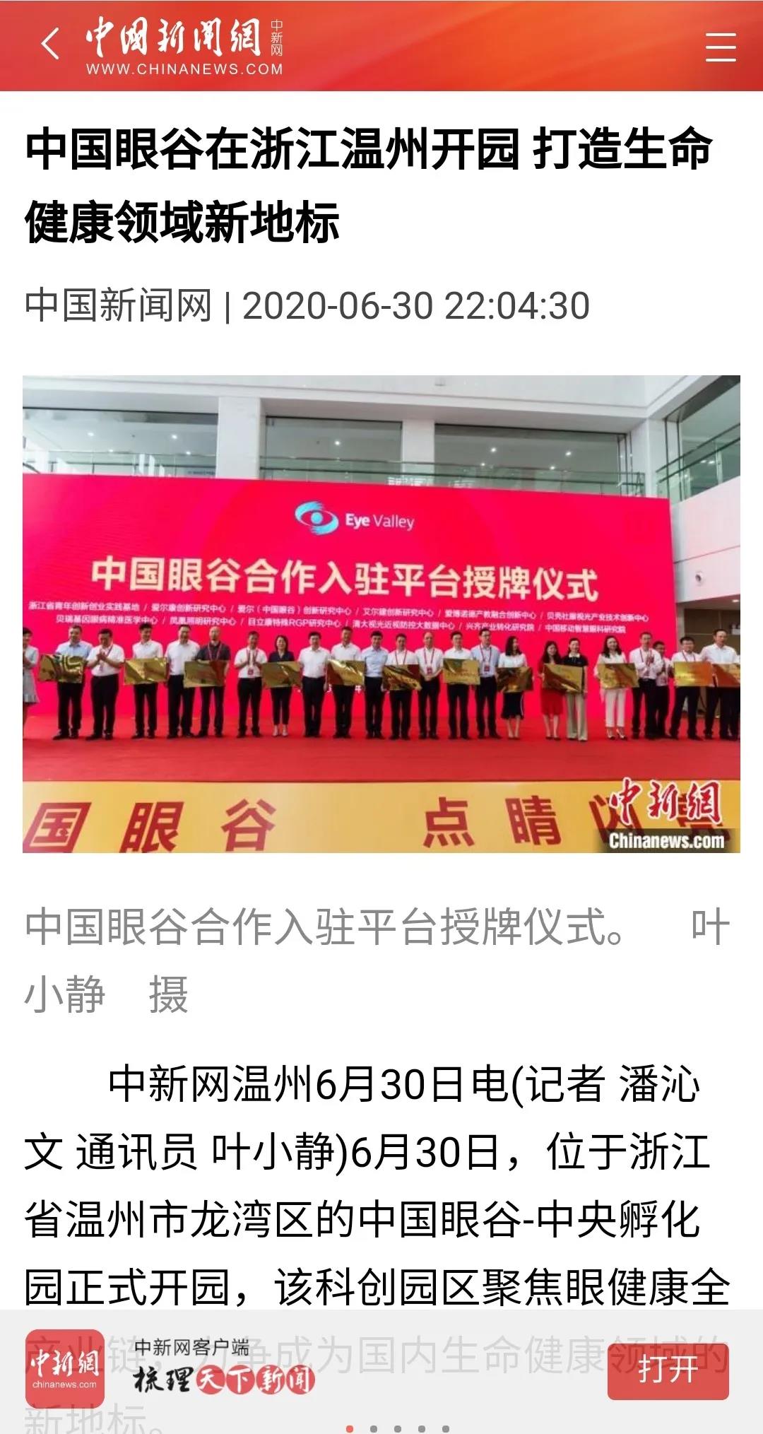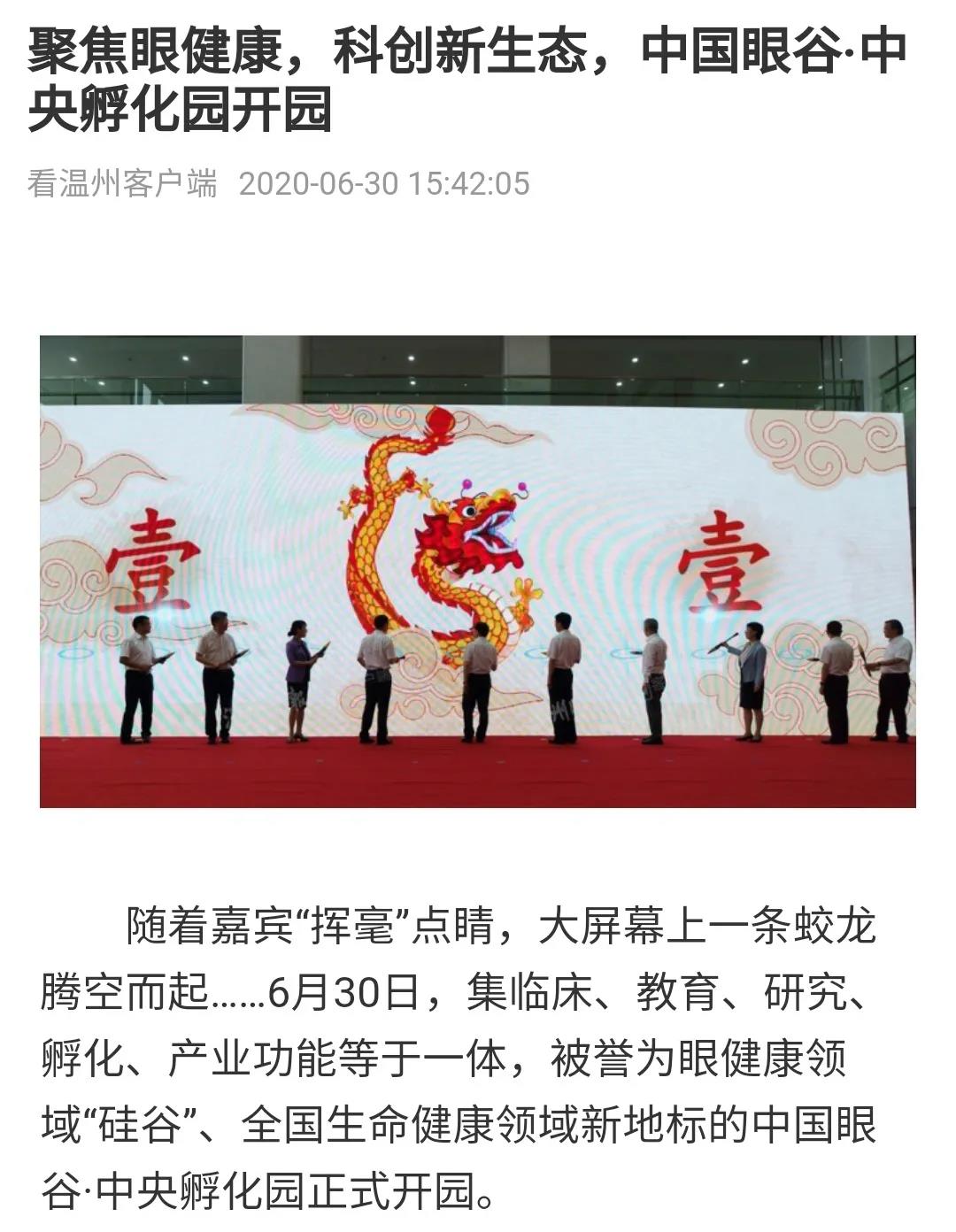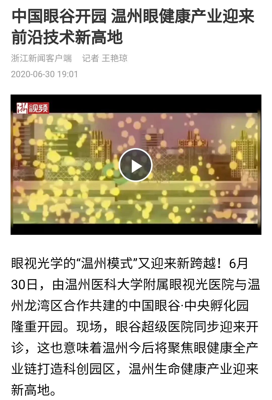 ? ? ? 此次活動受到了多方媒體的廣泛關(guān)注,學(xué)習(xí)強國、人民網(wǎng)、新華網(wǎng)、光明日報、中國新聞網(wǎng)、健康報、中國教育新聞網(wǎng)、浙江日報、錢江晚報、溫州日報、溫州發(fā)布、溫州新聞、溫州電視臺、溫州晚報、溫州都市報、溫州商報、溫州新聞網(wǎng)、龍灣發(fā)布等國內(nèi)主流媒體,眼界、國際眼科時訊、中國眼鏡科技雜志等眼科領(lǐng)域的行業(yè)媒體,對此進行報道、轉(zhuǎn)載。人民網(wǎng)、網(wǎng)易兩個平臺現(xiàn)場直播,累積觀看人數(shù)已超百萬。中國眼谷這個聚焦眼健康的全產(chǎn)業(yè)鏈科創(chuàng)園區(qū),正在成為全國生命健康領(lǐng)域的新地標。