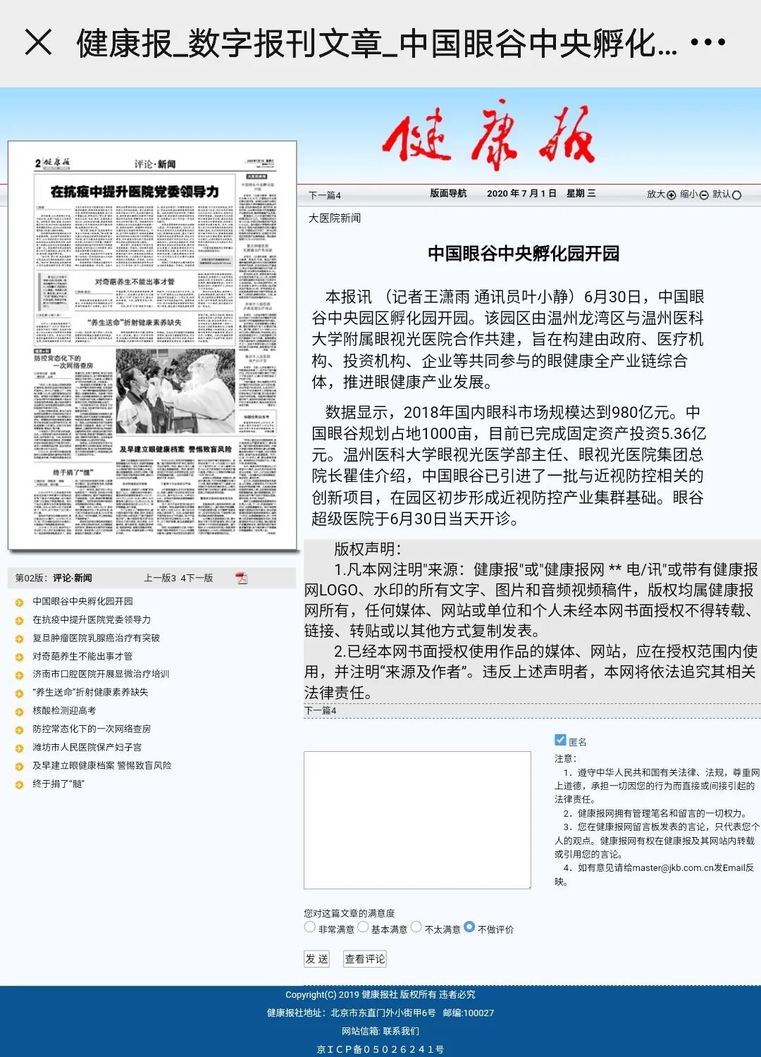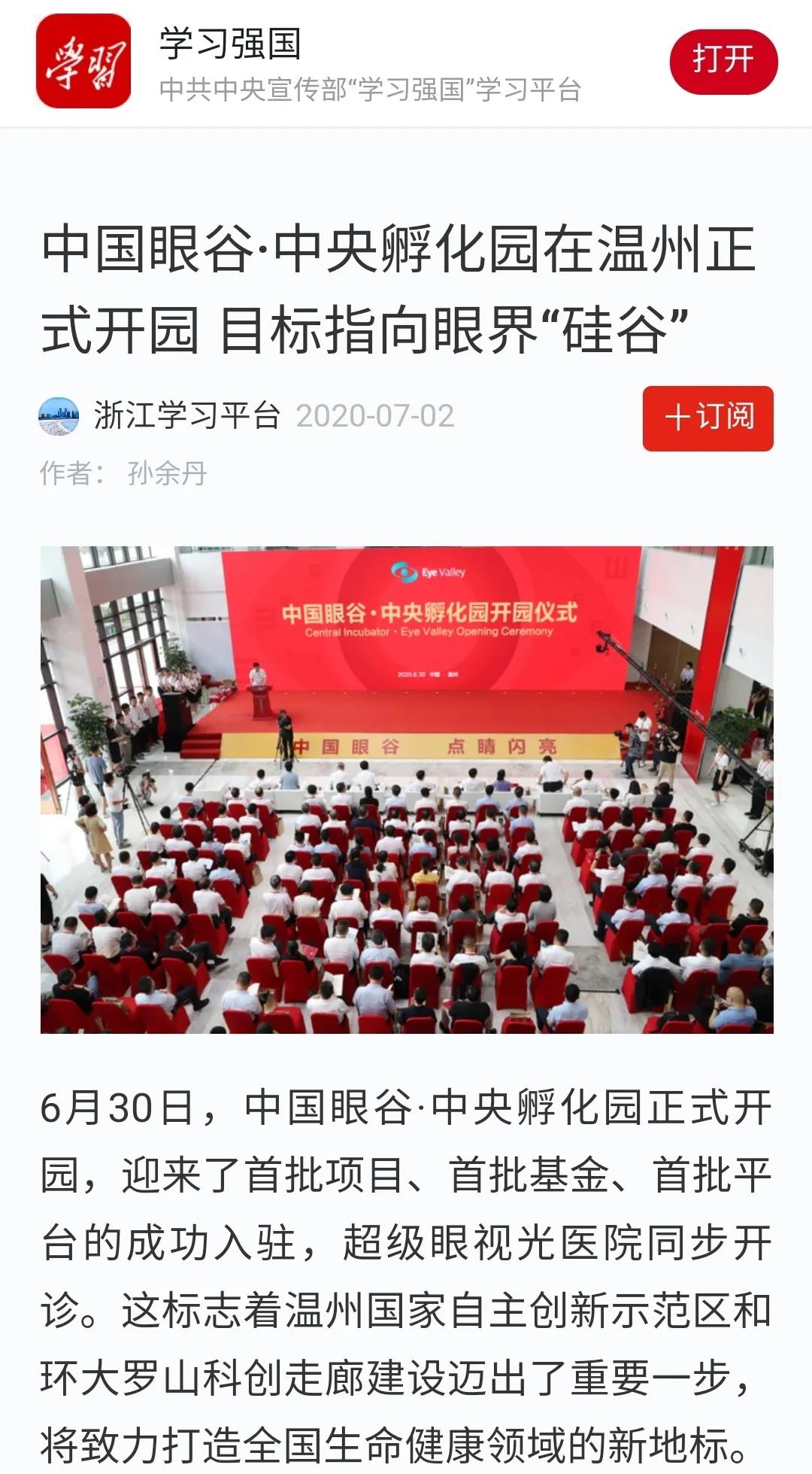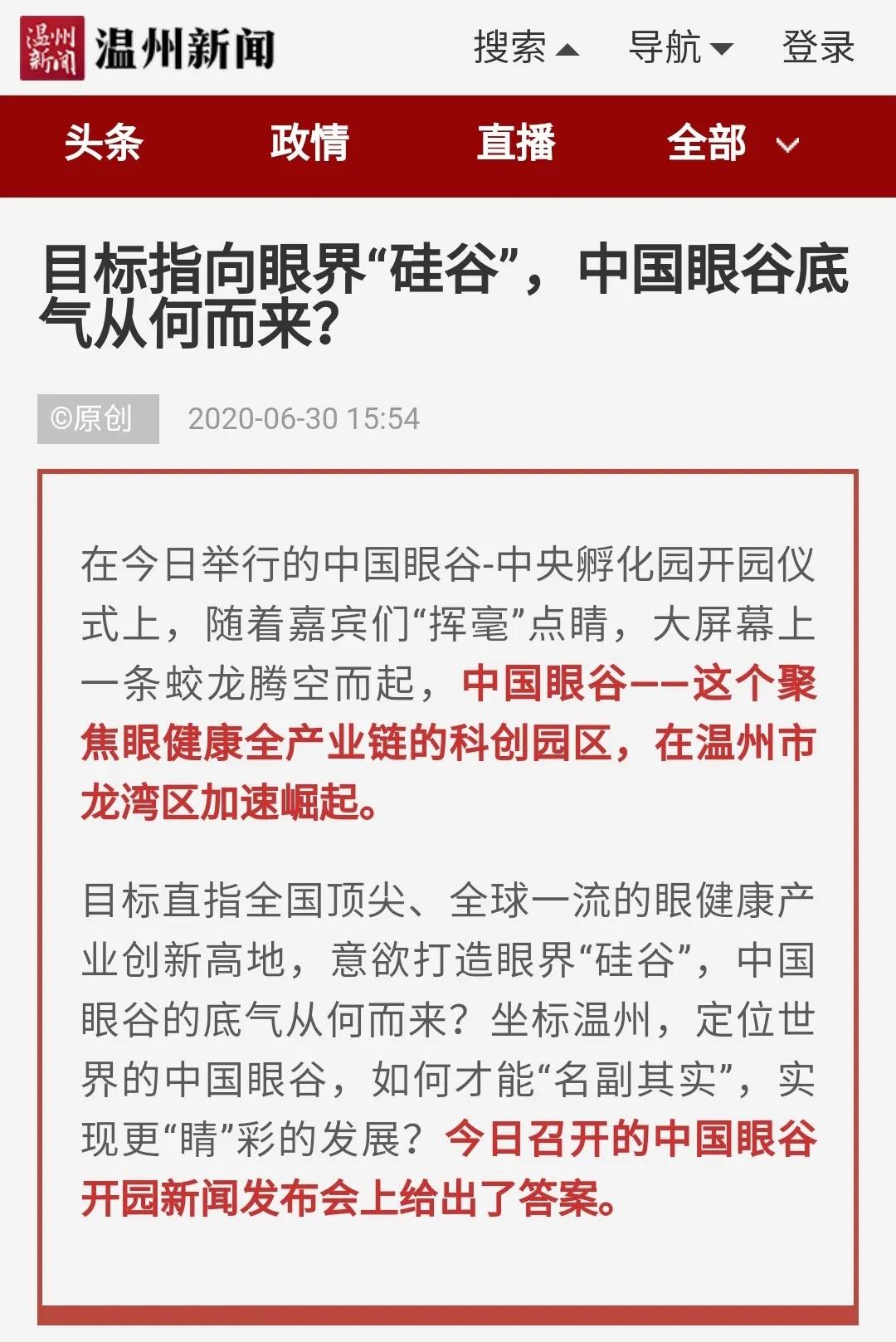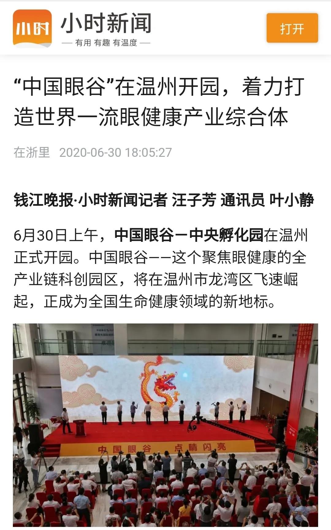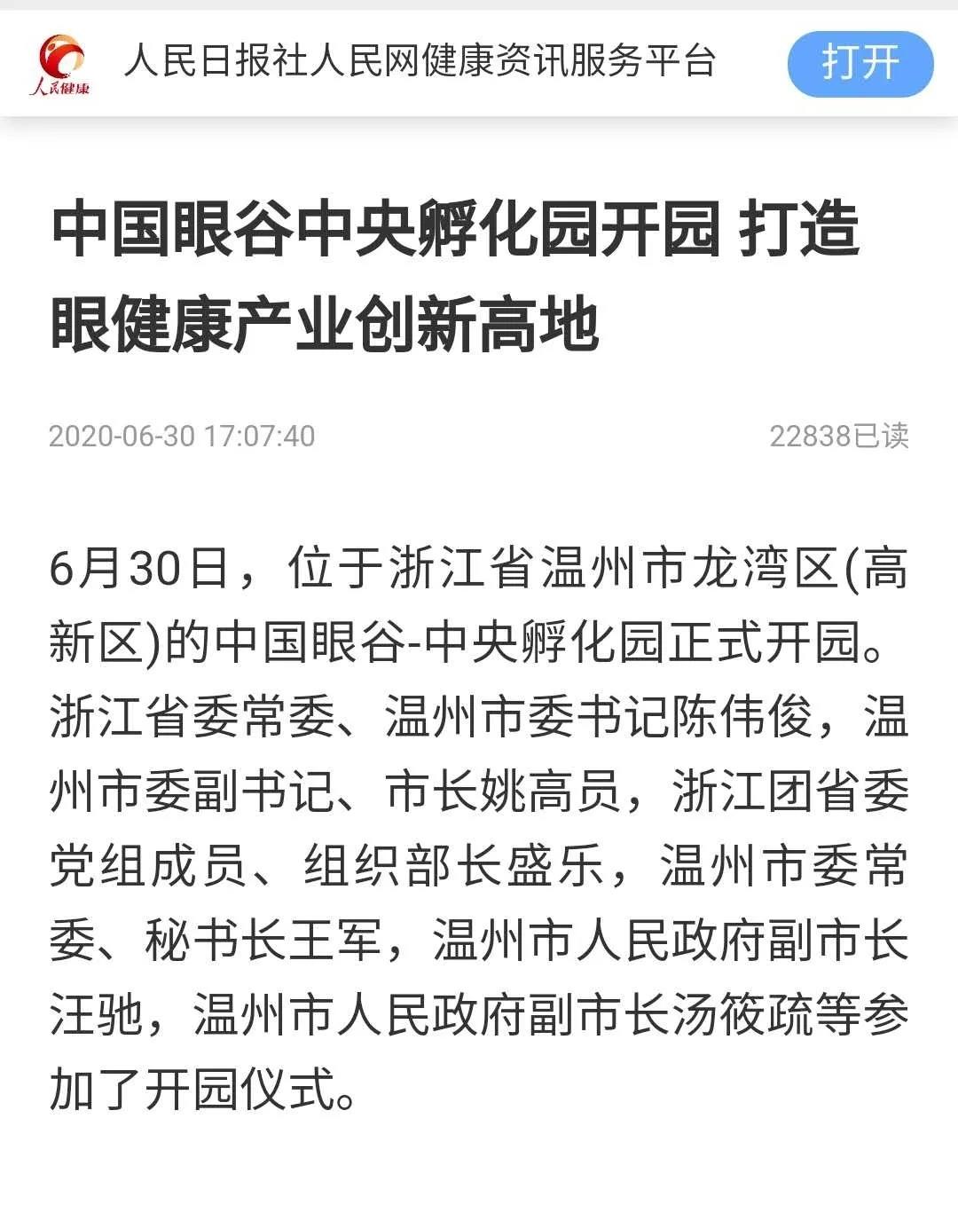 ? ? ? 此次活動受到了多方媒體的廣泛關(guān)注,學(xué)習(xí)強國、人民網(wǎng)、新華網(wǎng)、光明日報、中國新聞網(wǎng)、健康報、中國教育新聞網(wǎng)、浙江日報、錢江晚報、溫州日報、溫州發(fā)布、溫州新聞、溫州電視臺、溫州晚報、溫州都市報、溫州商報、溫州新聞網(wǎng)、龍灣發(fā)布等國內(nèi)主流媒體,眼界、國際眼科時訊、中國眼鏡科技雜志等眼科領(lǐng)域的行業(yè)媒體,對此進行報道、轉(zhuǎn)載。人民網(wǎng)、網(wǎng)易兩個平臺現(xiàn)場直播,累積觀看人數(shù)已超百萬。中國眼谷這個聚焦眼健康的全產(chǎn)業(yè)鏈科創(chuàng)園區(qū),正在成為全國生命健康領(lǐng)域的新地標。