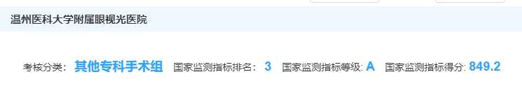 ? ? ? ?日前,國家衛(wèi)生健康委公布了2018年度三級(jí)公立醫(yī)院績效考核國家監(jiān)測指標(biāo)考核結(jié)果,在全國2398家參評(píng)醫(yī)院中,溫州醫(yī)科大學(xué)附屬眼視光醫(yī)院榮獲專科醫(yī)院最高等級(jí)A的評(píng)價(jià),排名三級(jí)公立醫(yī)院(手術(shù)專科類)績效考核浙江第一、全國前三!