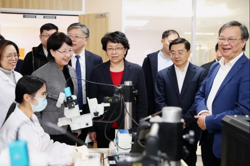 ? ? ? ?翁鐵慧副部長一行參觀了院史館、臨床教學(xué)實(shí)驗(yàn)中心和日間病區(qū),溫州醫(yī)科大學(xué)眼視光醫(yī)學(xué)部主任瞿佳,國家眼部疾病臨床醫(yī)學(xué)研究中心主任呂帆,院領(lǐng)導(dǎo)張建、吳文燦、陳浩、周翔天、陳潔等陪同。學(xué)部主任瞿佳向翁鐵慧副部長一行匯報(bào)了溫醫(yī)大眼視光學(xué)科建設(shè)總體情況,并展示了我院在教學(xué)、科研、醫(yī)療等領(lǐng)域的創(chuàng)新成就和青少年近視防控、中國眼谷建設(shè)等方面的突出成績。