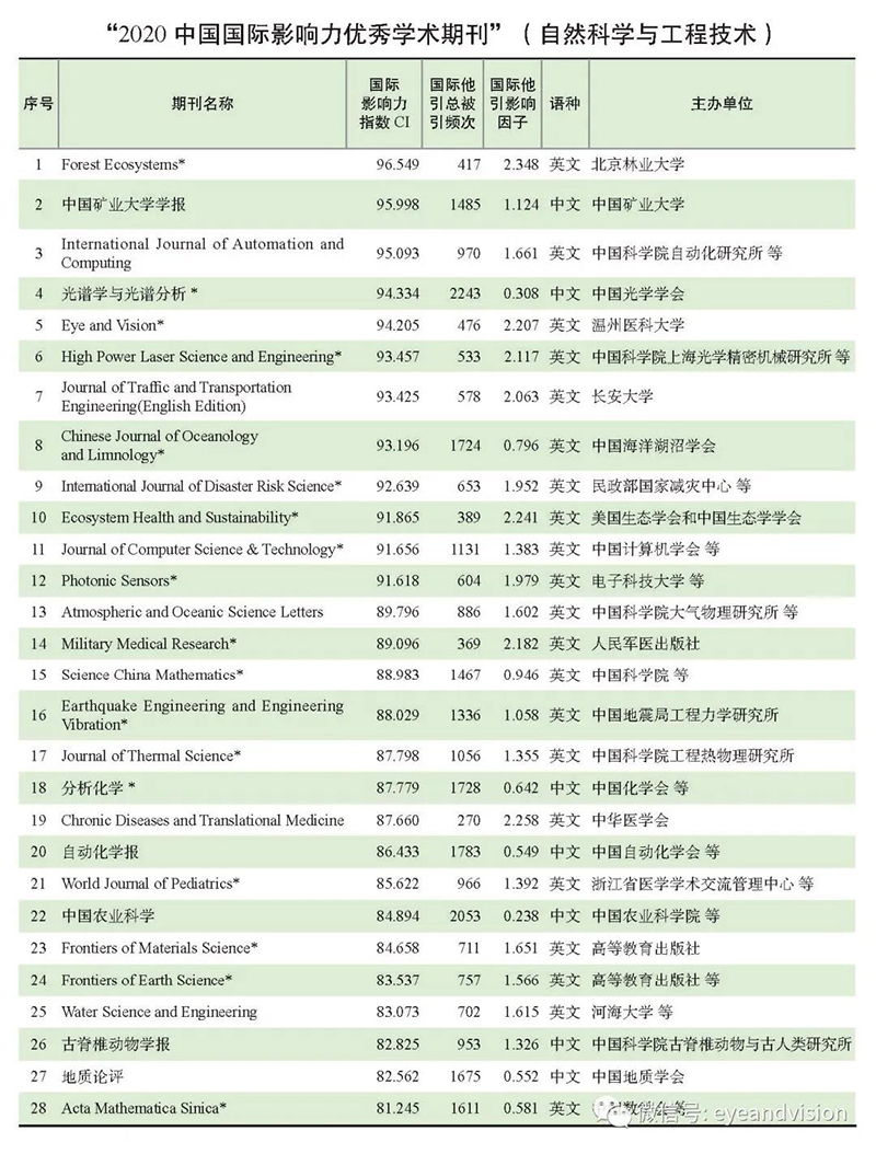 ? ? ? ?2020年12月17日,在由中國知網(wǎng)、中國科學文獻計量評價研究中心和清華大學圖書館聯(lián)合發(fā)布的《中國學術(shù)期刊國際引證年報》中,由溫州醫(yī)科大學附屬眼視光醫(yī)院主辦的SCI期刊Eye and Vision,分別以國際影響力指數(shù)94.205、國際他引總被引頻次476以及國際他引影響因子2.207等綜合指標,入選“2020中國國際影響力優(yōu)秀學術(shù)期刊(自然科學與工程技術(shù)類)”榜單,是唯一入選的眼科學期刊。