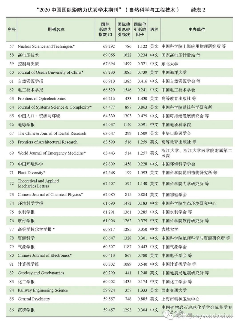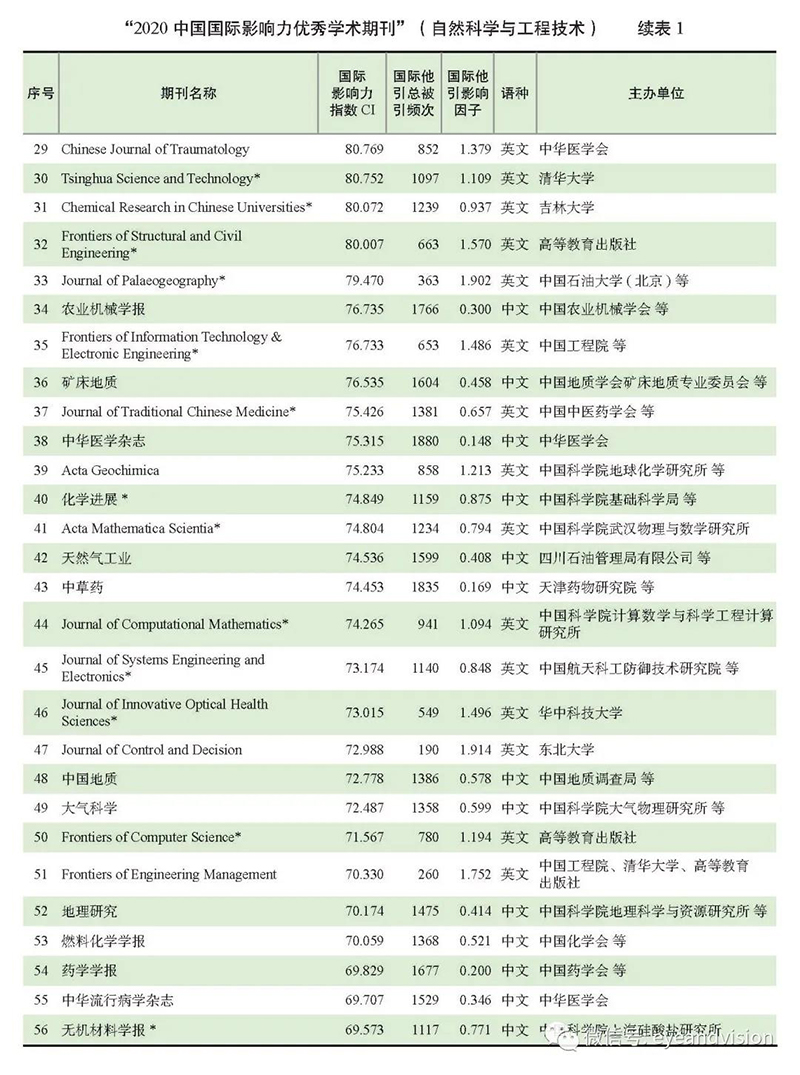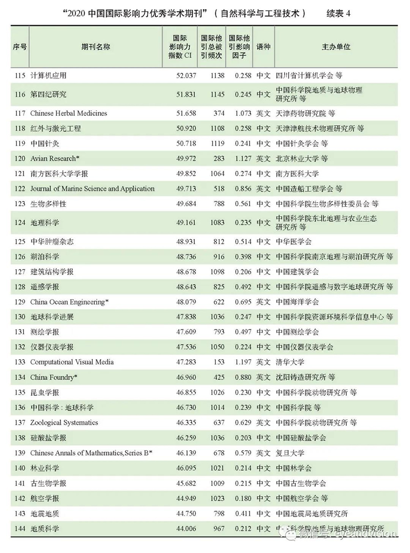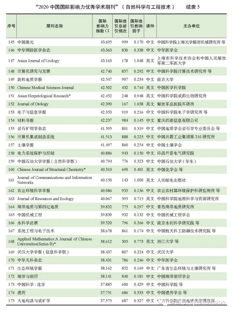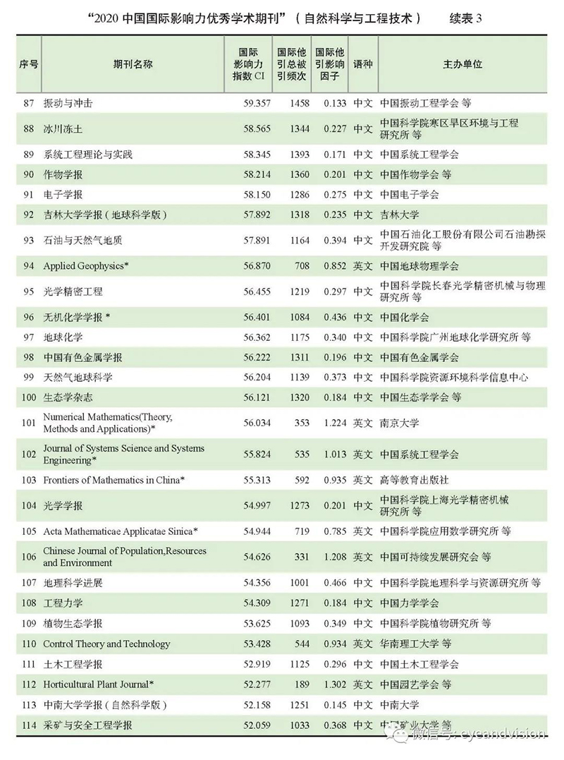 附:“2020中國國際影響力優(yōu)秀學術(shù)期刊(自然科學與工程技術(shù)類)”完整榜單