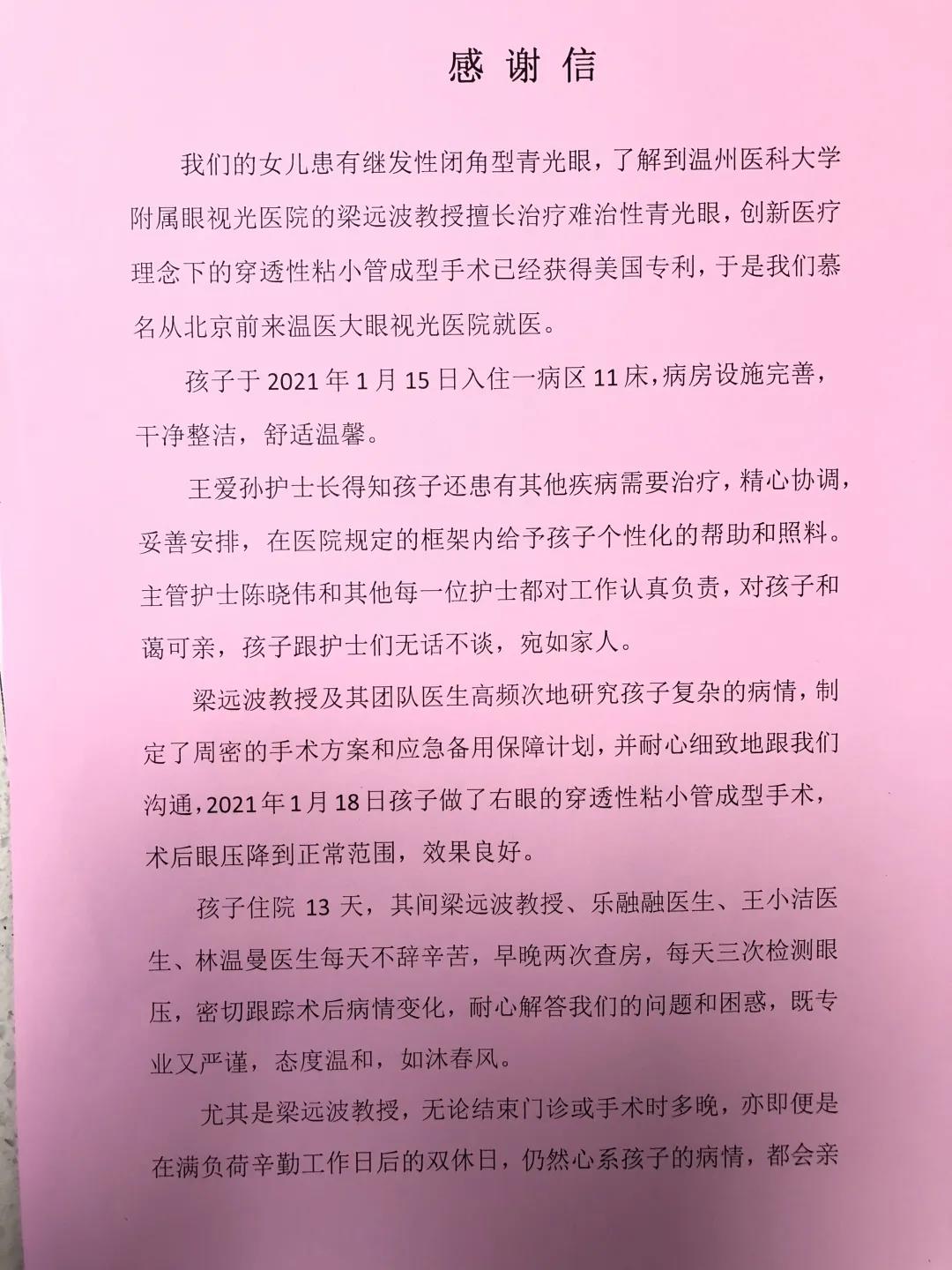 ? ? ? 由于手術(shù)效果滿意,小樹于2月19號(hào)再次入院進(jìn)行左眼青光眼手術(shù)。術(shù)后,?小樹的眼壓降至正常范圍,中央前房逐漸加深,效果明顯。兩次手術(shù),住院觀察時(shí)垮35天里,梁教授不辭辛苦,無論門診或手術(shù)多忙,一定早晚兩次到病房查房,耐心解答家屬的問題和困惑,團(tuán)隊(duì)醫(yī)生每天三次為小樹測(cè)量i-care眼壓,密切跟蹤術(shù)后病區(qū)變化。“十分感恩梁遠(yuǎn)波教授及其團(tuán)隊(duì)醫(yī)生的醫(yī)者仁心和精湛醫(yī)術(shù)!”小樹父母為表感謝,特意送了感謝信和錦旗到一病區(qū)。