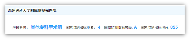 ? ? ? 近日,國(guó)家衛(wèi)生健康委公布了2019年度三級(jí)公立醫(yī)院績(jī)效考核國(guó)家監(jiān)測(cè)指標(biāo)考核結(jié)果,溫州醫(yī)科大學(xué)附屬眼視光醫(yī)院排名三級(jí)公立醫(yī)院(手術(shù)專科類)浙江第一、全國(guó)前四,獲最高等級(jí)A的評(píng)價(jià),其中13項(xiàng)考核指標(biāo)均獲滿分,考核總分再創(chuàng)新高!