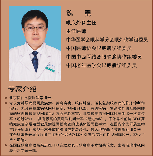 ? ? 家屬心急如焚,多方打聽,后來在溫醫(yī)大眼視光公眾號(hào),看到魏勇主任團(tuán)隊(duì)通過微創(chuàng)玻璃體手術(shù)結(jié)合41G針玻璃體腔注射溶血藥(TPA)治療黃斑下大量出血的報(bào)道。魏勇團(tuán)隊(duì)是國內(nèi)最早采用這項(xiàng)技術(shù)治療該疾病、也是國內(nèi)完成這類手術(shù)最多的團(tuán)隊(duì)之一。李阿姨當(dāng)晚就從青島,飛越千里來到溫州,尋求魏勇主任的幫忙。