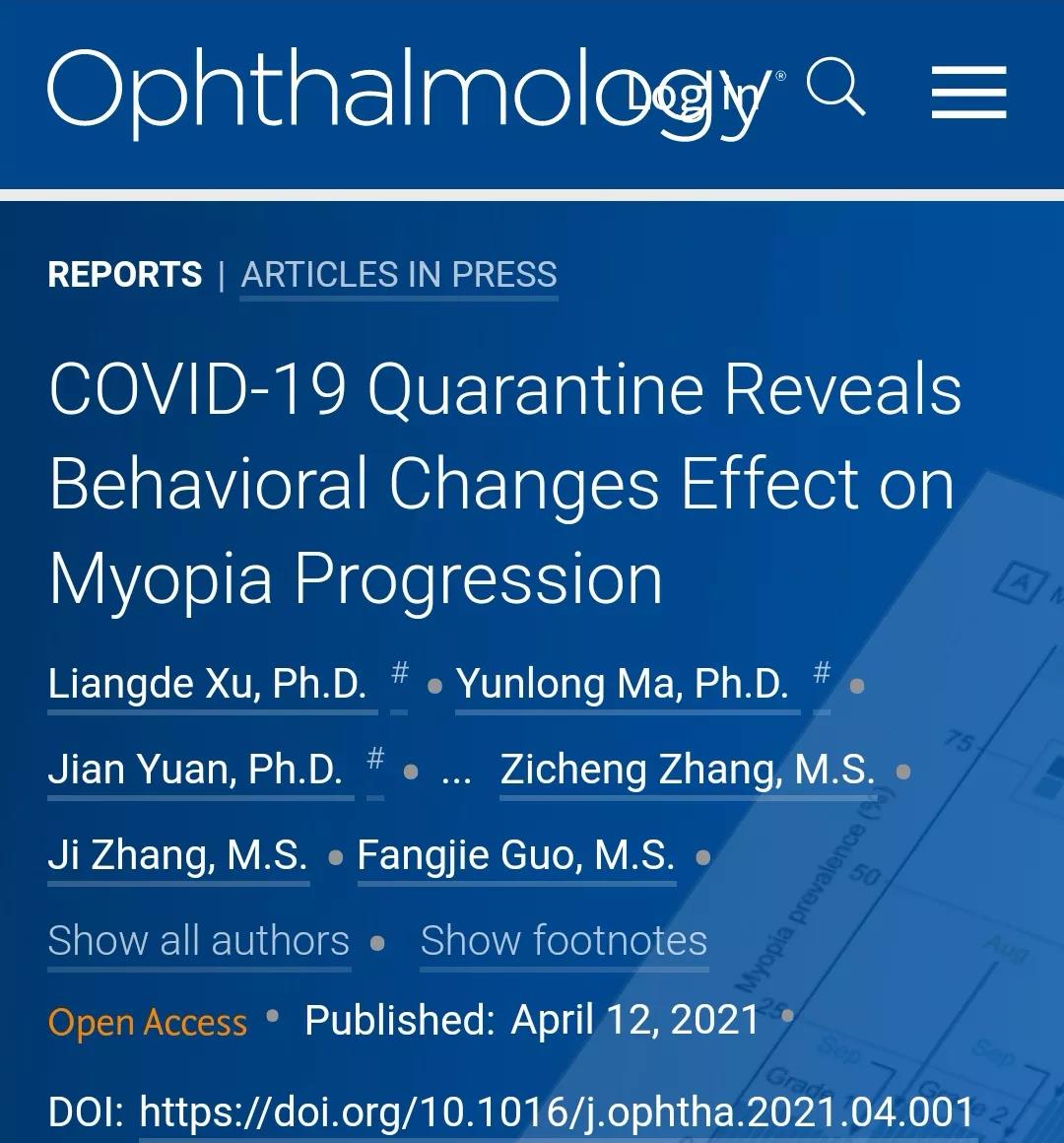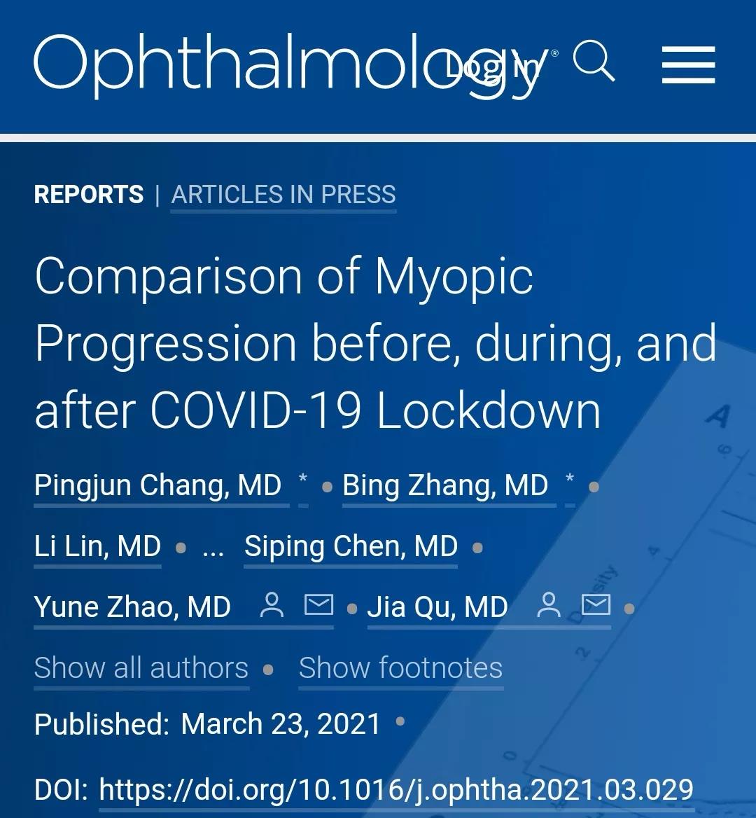 2. Chang P#, Zhang Bing#, Lin Li, Chen R, Chen S, Zhao Y*, Qu J*. Comparison of Myopic Progression before, during, and after COVID-19 Lockdown. Ophthalmology, 2021, March 23. (https://www.aaojournal.org/article/S0161-6420(21)00234-7/fulltext)