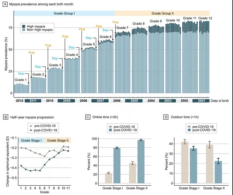 ? ? ? 對(duì)此,瞿佳教授團(tuán)隊(duì)自2019年3月起,牽頭教育部近視防控與診治工程研究中心、浙江省兒童青少年近視防控工作指導(dǎo)中心,創(chuàng)建以學(xué)校普查為基礎(chǔ)的全市域、超百萬(wàn)、高時(shí)效近視篩查和防控體系,通過(guò)大數(shù)據(jù)解讀進(jìn)一步闡釋中小學(xué)生近視發(fā)生發(fā)展的基本規(guī)律,并通過(guò)新冠疫情前后中小學(xué)生近視變化情況分析,揭示了特定環(huán)境因素對(duì)兒童青少年近視的內(nèi)在影響。