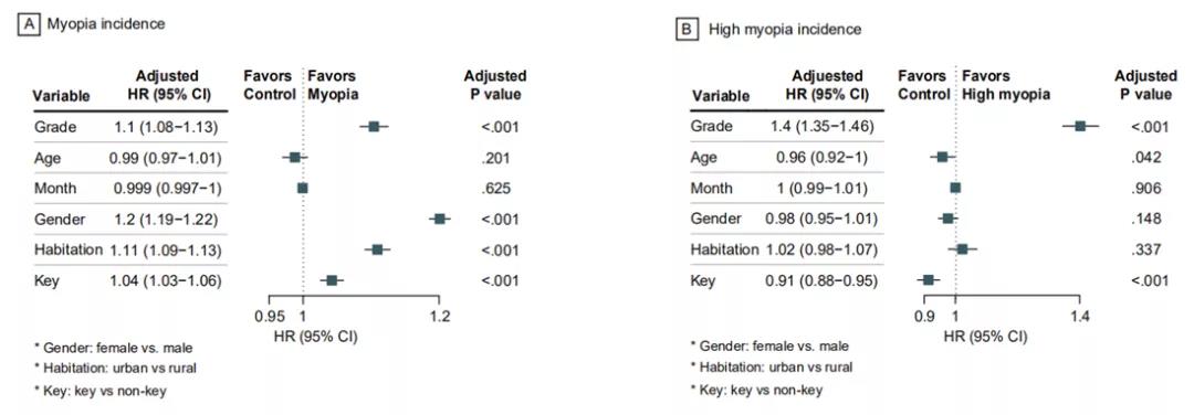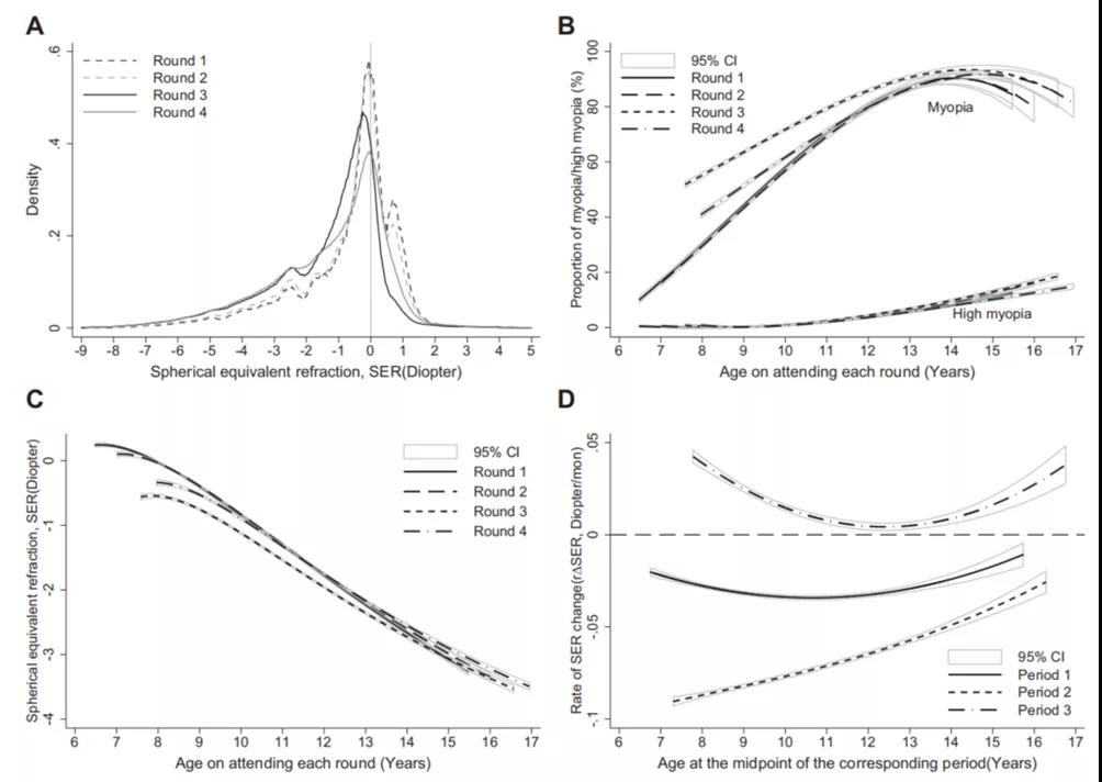 ? ? ? 溫州地區(qū)的研究工作以2019年6月的首次普查為基線,涉及有效普查學(xué)生人數(shù)101萬(wàn)(55萬(wàn)名男生和45萬(wàn)名女生),持續(xù)普查數(shù)據(jù)顯示近視率從基線的52.89%增至2020年6月的59.35%,高度近視率從基線的4.11%增加到4.99%。多因素Cox比例風(fēng)險(xiǎn)回歸分析揭示年級(jí)因素而非年齡因素與近視和高度近視的進(jìn)展顯著相關(guān)。