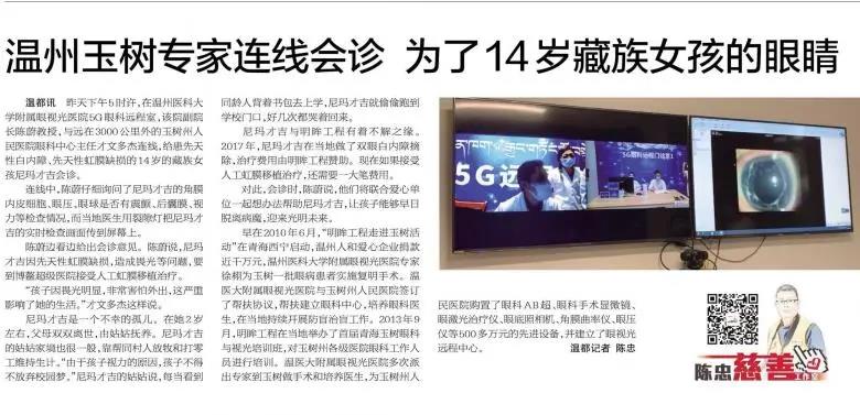 ? ? ? 8月11日,溫州醫(yī)科大學附屬眼視光醫(yī)院副院長、溫州醫(yī)科大學眼視光醫(yī)院集團副總院長、海南博鰲分院院長陳蔚教授,與遠在3000公里外的玉樹州人民醫(yī)院眼科中心主任才文多杰連線,為患先天性白內(nèi)障、先天性虹膜缺損的14歲的藏族女孩尼瑪才吉會診。連線中,陳蔚教授仔細詢問了尼瑪才吉眼睛的情況,玉樹當?shù)氐尼t(yī)生通過5G眼科遠程診療系統(tǒng)將尼瑪才吉的裂隙燈畫面實時傳送到溫州。一場跨越千里的5G眼科遠程門診在溫州醫(yī)科大學附屬眼視光醫(yī)院有條不紊的進行著……