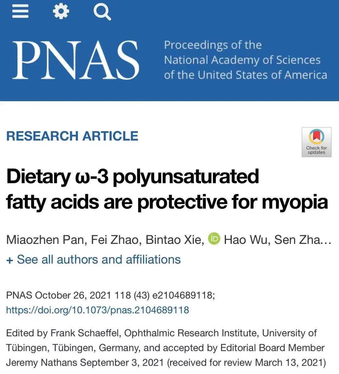 ? ? ? 近日,溫州醫(yī)科大學(xué)附屬眼視光醫(yī)院的瞿佳、周翔天團隊在《美國科學(xué)院院刊》發(fā)表了最新科研成果。研究論文顯示,口服富含ω-3多不飽和脂肪酸的魚油能起到近視防控作用。