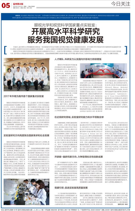 ? ? ??2017年以來,實驗室在科研條件、研究能力、人才團隊等方面繼續(xù)取得新的突破,包括獲批國家重點研發(fā)計劃項目3項(首席科學(xué)家),實驗室成員入選國家杰出青年科學(xué)基金、浙江省特級專家等,在世界自然科學(xué)領(lǐng)域頂級期刊《Science》《Nature Methods》《PNAS》等發(fā)表研究成果,其中在眼科基礎(chǔ)研究最具影響力的期刊《Investigative Ophthalmology & Visual Science》發(fā)表論文數(shù)連續(xù)多年位居國際前列,獲得中華醫(yī)學(xué)科技一等獎、浙江省自然科學(xué)一等獎等,科衛(wèi)協(xié)同、全鏈條研究和轉(zhuǎn)化的體系建設(shè)進(jìn)一步提升,在區(qū)域科技創(chuàng)新體系中發(fā)揮著重要的力量。
