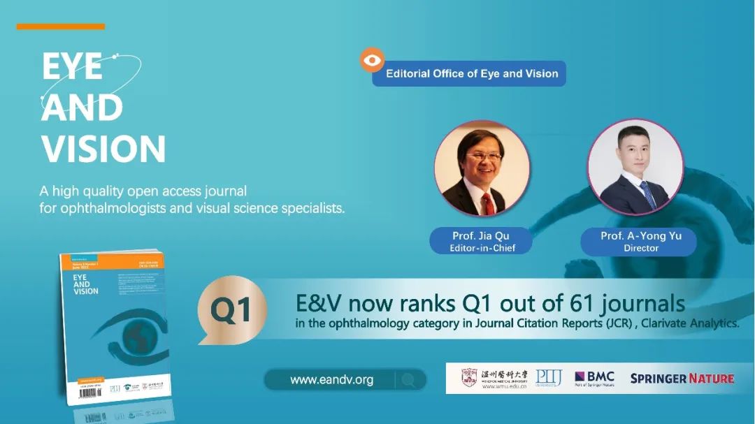 ? ? ? Eye and Vision 已連續(xù)四年入選“中國最具國際影響力學(xué)術(shù)期刊”和“中國國際影響力優(yōu)秀學(xué)術(shù)期刊”榜單,并被SCI、Scopus、PubMed/PubMed Central、DOAJ等國際權(quán)威數(shù)據(jù)庫收錄。Eye and Vision 最新影響因子為4.427,位于JCR眼科學(xué)Q1區(qū),在全球61種眼科SCI期刊中排名第12位,5年影響因子4.749,排名第10位。