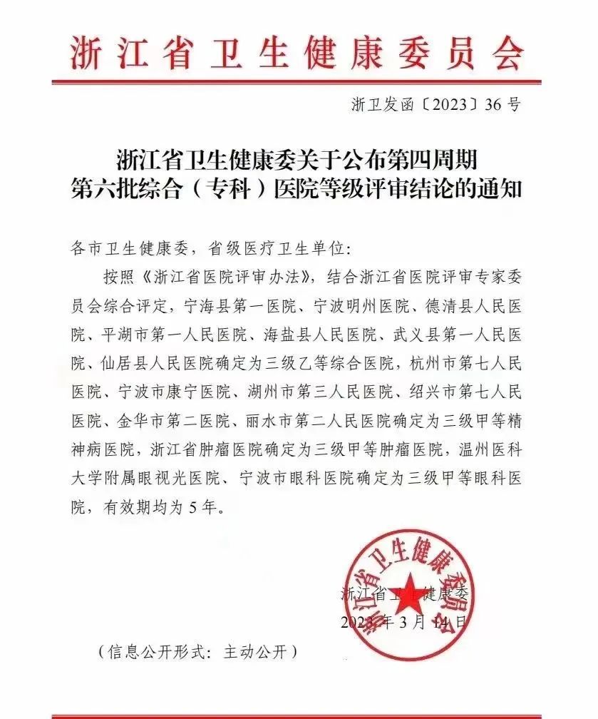 ? ? ? 3月14日,浙江省衛(wèi)健委發(fā)布《關(guān)于公布第四周期第六批綜合(??疲┽t(yī)院等級(jí)評(píng)審結(jié)論的通知》,寧波市眼科醫(yī)院正式晉升為浙江三級(jí)甲等眼科醫(yī)院,成為浙東地區(qū)唯一一家公立三甲眼科醫(yī)院,標(biāo)志著醫(yī)院邁入了新跑道、踏上了新征程。