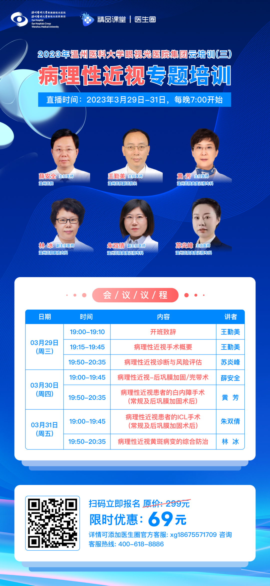 ? ? ? 為進(jìn)一步提升病理性近視診治水平,規(guī)范病理性近視手術(shù)操作流程和步驟,溫州醫(yī)科大學(xué)眼視光醫(yī)院集團(tuán)首席醫(yī)療官王勤美教授,攜手資深講師團(tuán),為大家?guī)?lái)3天6課時(shí)的“病理性近視”專(zhuān)題系列培訓(xùn)課程。授課內(nèi)容豐富,實(shí)用性強(qiáng),探討和解決臨床的實(shí)際問(wèn)題。