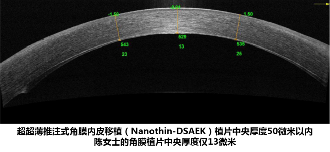 ? ? 4月,由溫醫(yī)大眼視光醫(yī)院副院長(zhǎng)、角膜病專家陳蔚教授主刀,為陳女士實(shí)施了全國(guó)首創(chuàng)的“超超薄推注式角膜內(nèi)皮移植術(shù)”。術(shù)后一周她的裸眼視力從原來只能看到30厘米以內(nèi)的手指,上升到了0.5。一個(gè)月后陳女士門診復(fù)查,角膜透明,內(nèi)皮植片貼附良好,測(cè)量植片最薄處僅有13微米,角膜內(nèi)皮細(xì)胞密度為2230個(gè)/mm^2。