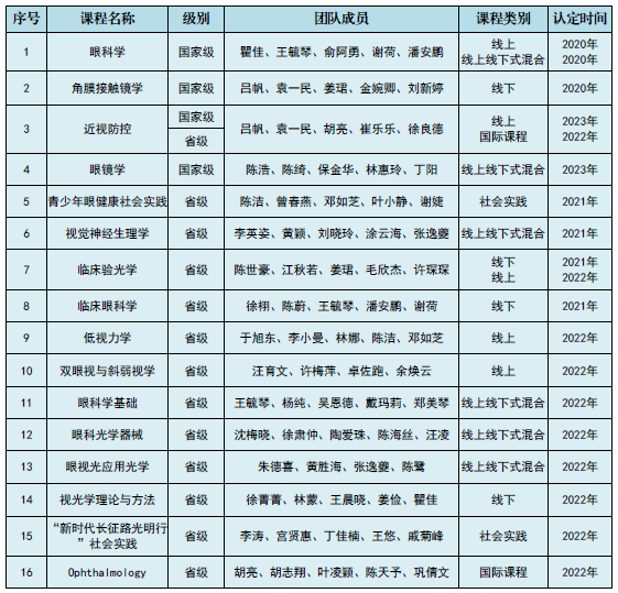 ? ? ? 其中,呂帆、袁一民、胡亮、崔樂樂、徐良德等老師負(fù)責(zé)的《近視防控》獲批線上一流課程;陳浩、陳綺、保金華、林惠玲、丁陽等老師負(fù)責(zé)的《眼鏡學(xué)》獲批線上線下混合式一流課程。推薦獲批率為100%。