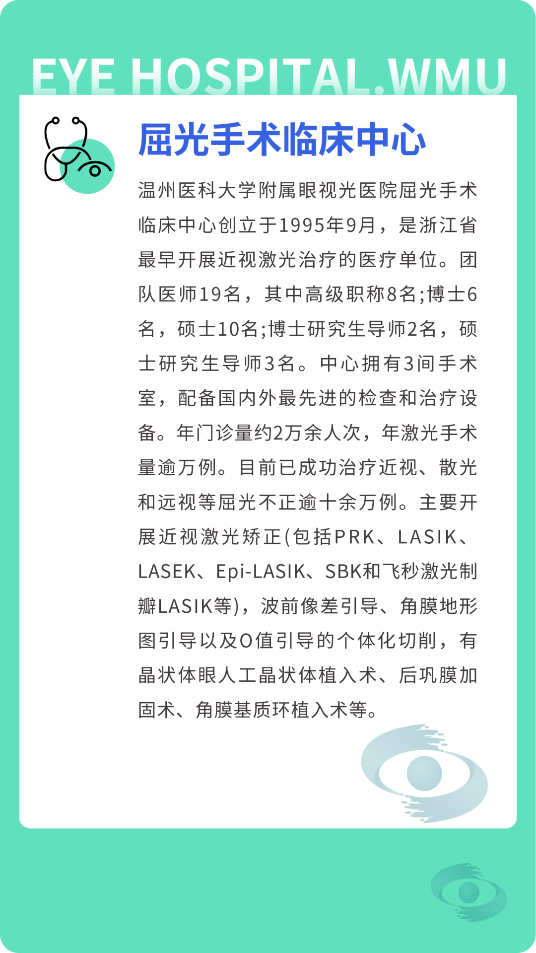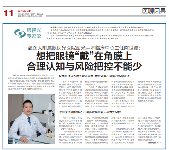 ? ? ? 近期,溫州醫(yī)科大學附屬眼視光醫(yī)院推出“眼視光專家說”系列報道,圍繞屈光矯正手術這一熱門話題,由多位屈光矯正手術資深專家從不同切入點進行講解,幫助有需要的患者重新正確、客觀認識屈光矯正手術。